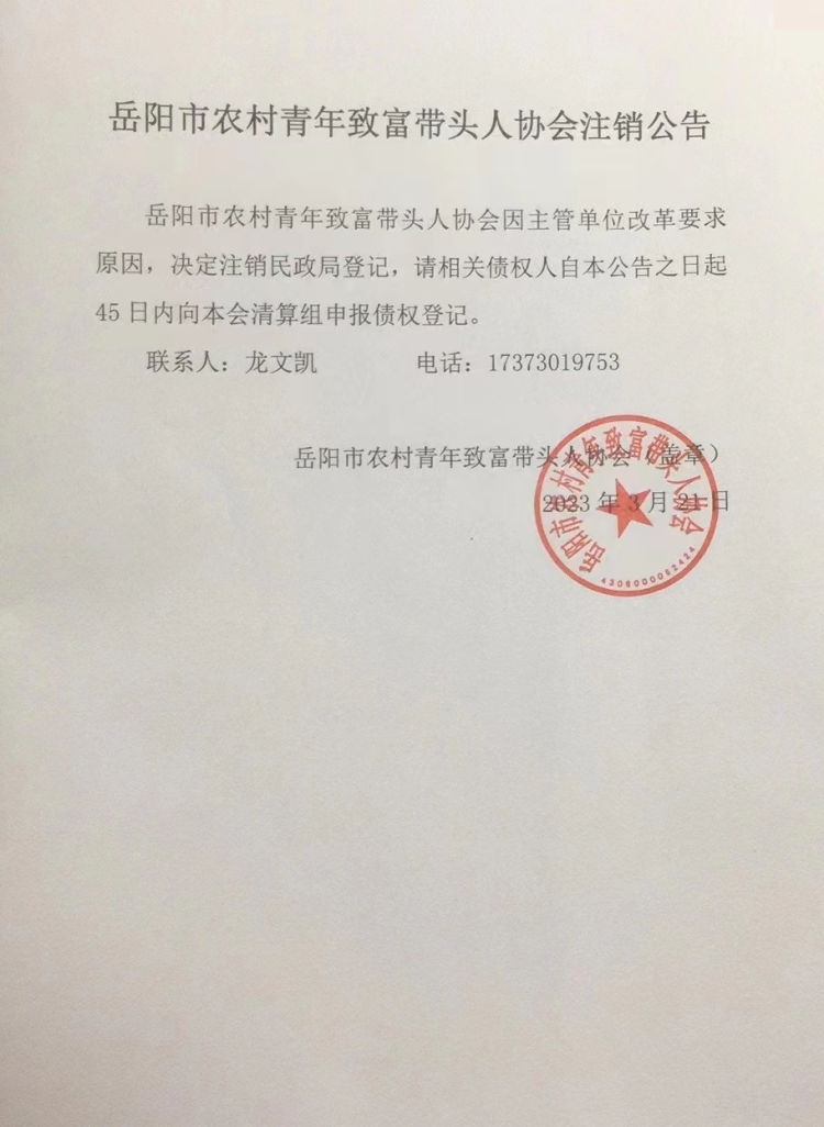 岳阳市农村青年致富带头人协会注销公告