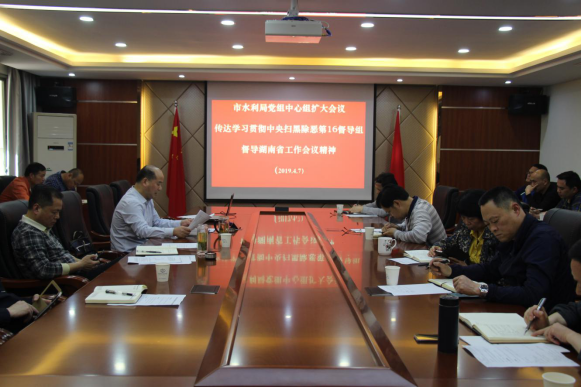 4月7日,市水利局党组书记、局长主持召开党组中心组扩大会议,传达学习贯彻中央扫黑除恶第16督导组督导湖南省工作会议精神。
