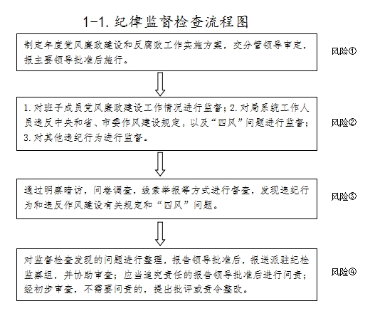 (三)科室自查阶段(5月15日前完成)。各单位(科室)对应职责权限,查找在权力运行、业务流程、制定机制和外部风险等方面或可能存在的廉政风险,并认真分析廉政风险的内容和形式,制定相应防控措施,同时结合科室职责,绘制单项职责流程,优化权力和业务运行流程,做到流程清晰、权责明确。