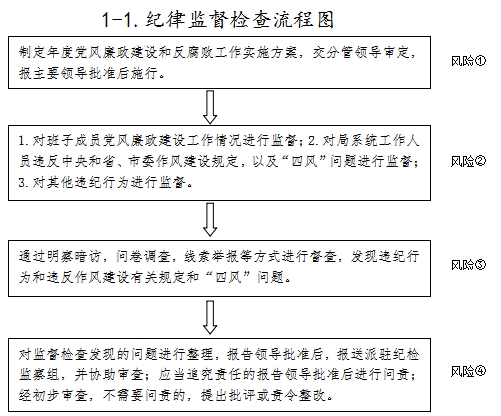 (三)科室自查阶段(5月15日前完成)。各单位(科室)对应职责权限,查找在权力运行、业务流程、制定机制和外部风险等方面或可能存在的廉政风险,并认真分析廉政风险的内容和形式,制定相应防控措施,同时结合科室职责,绘制单项职责流程,优化权力和业务运行流程,做到流程清晰、权责明确。