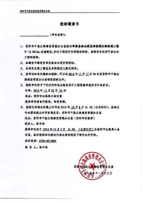 岳阳市干线公路建设管理办公室拟对华容县松木桥至李家湖公路新建工程计12.691km实施建设,工程内容包括:路基、路面、桥梁、涵洞、交安、绿化工程等,并对工程实行内部邀请招标。