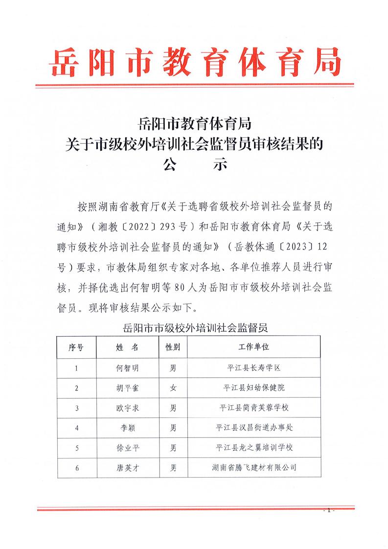 关于市级校外培训社会监督员审核结果的公示