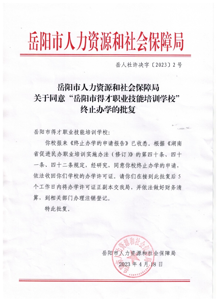岳阳市人力资源和社会保障局关于同意“岳阳市得才职业技能培训学校”终止办学的批复
