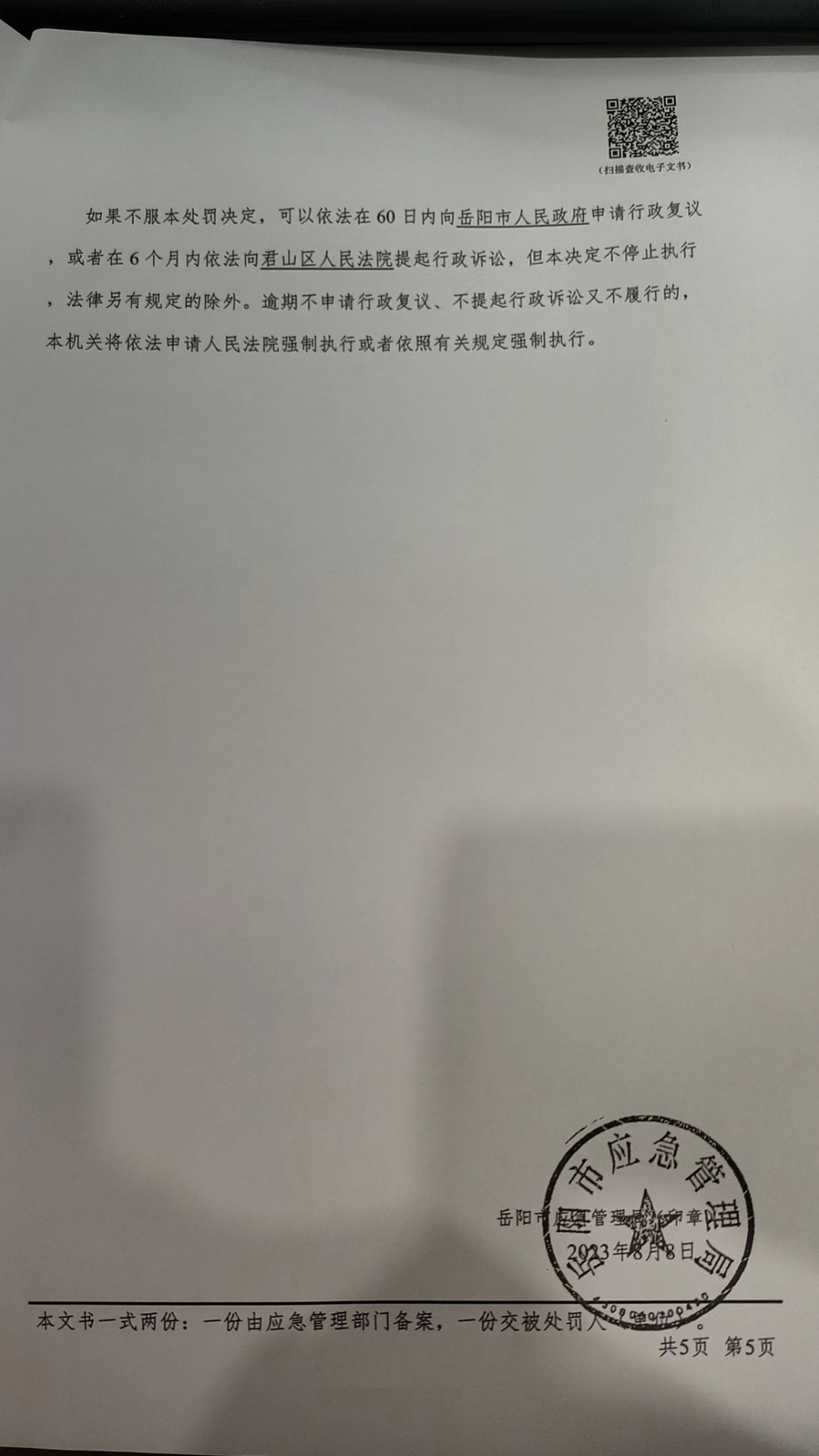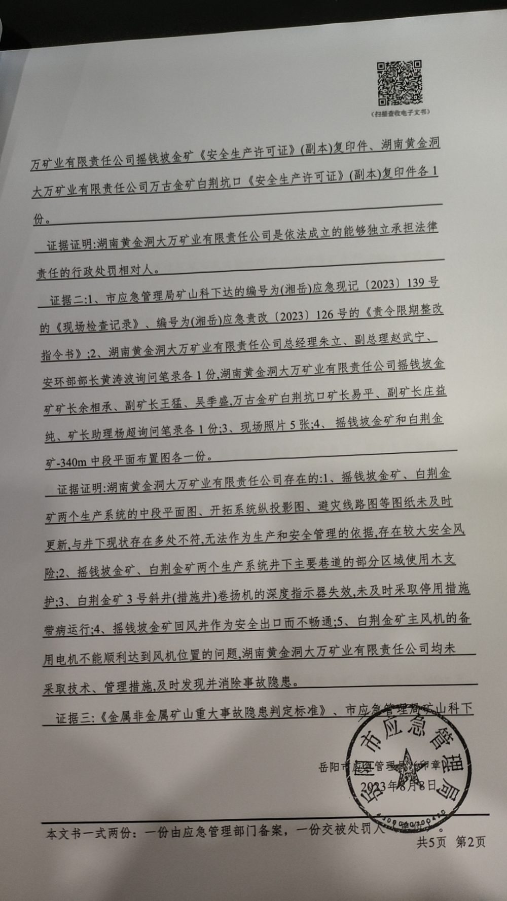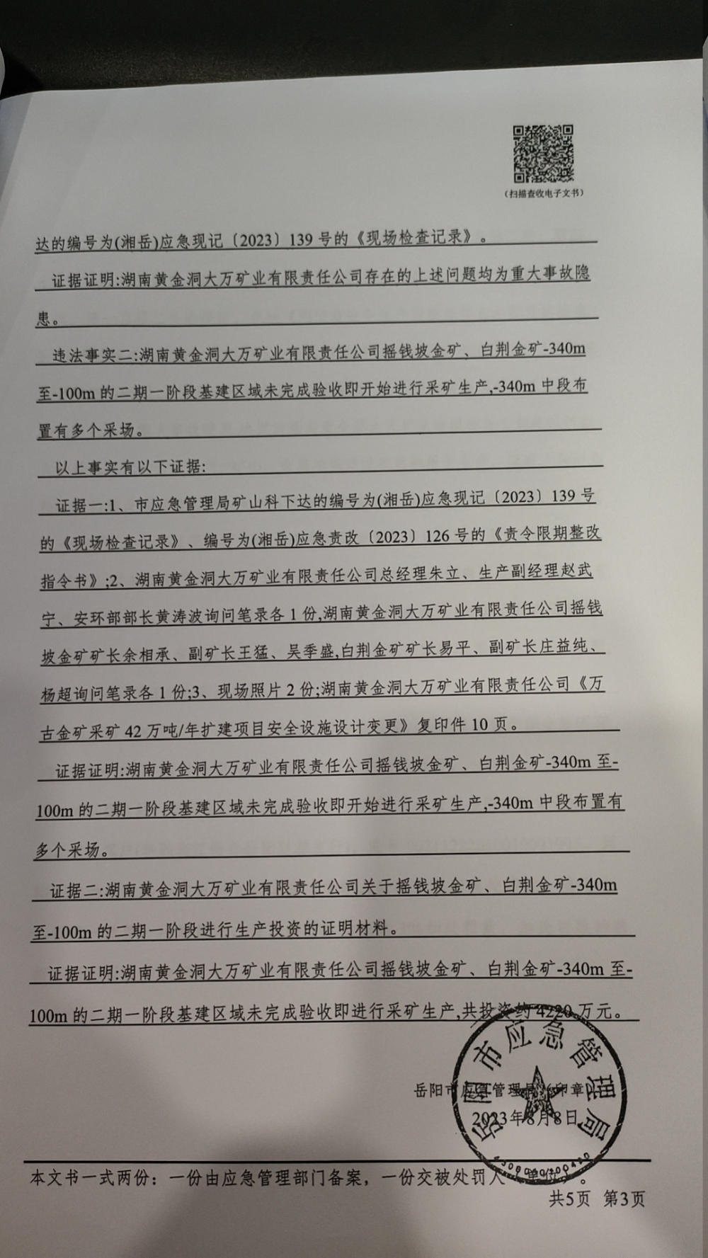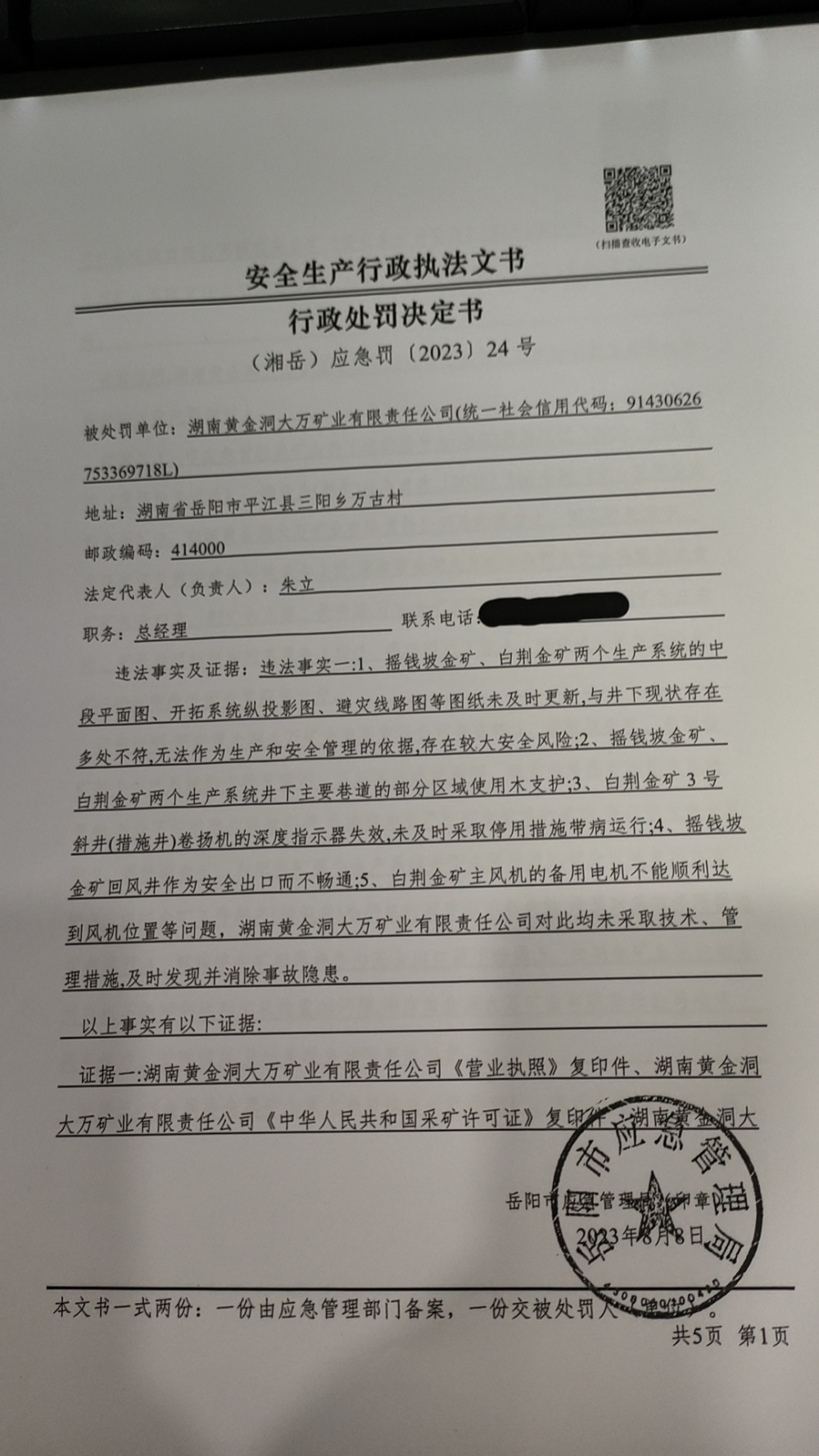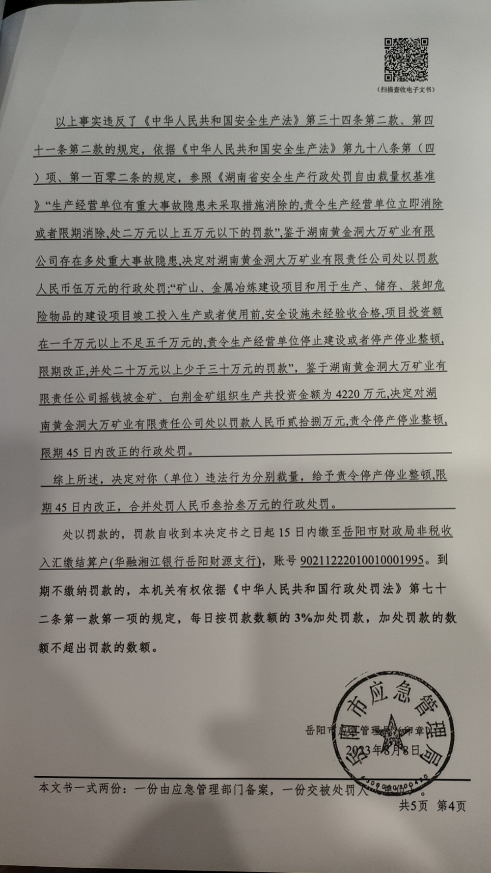 湖南黄金洞大万矿业有限责任公司行政处罚决定书