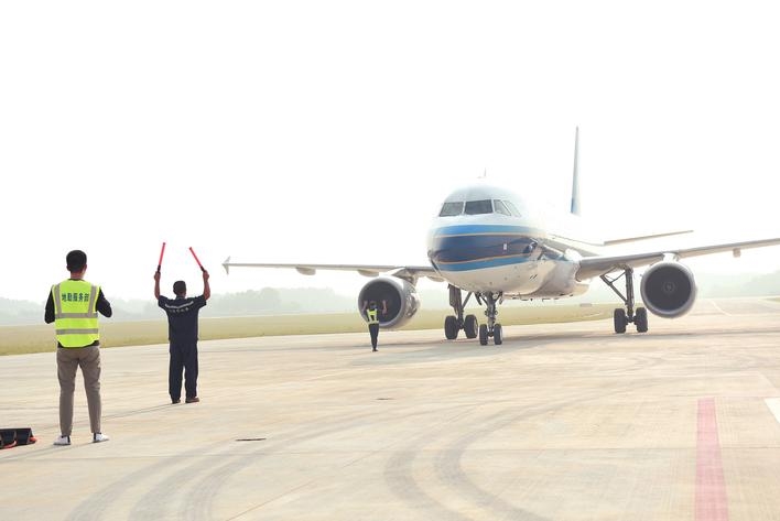 经过严格的安检程序,记者进入三荷机场飞机坪。场内工作人员正在有条不紊进行准备工作,客梯车、清水车、拖水车、传送带车已经就位,不远处消防保障车、医疗救援车正严阵以待。7:30分,记者站在指定区域,静候客机的到来。