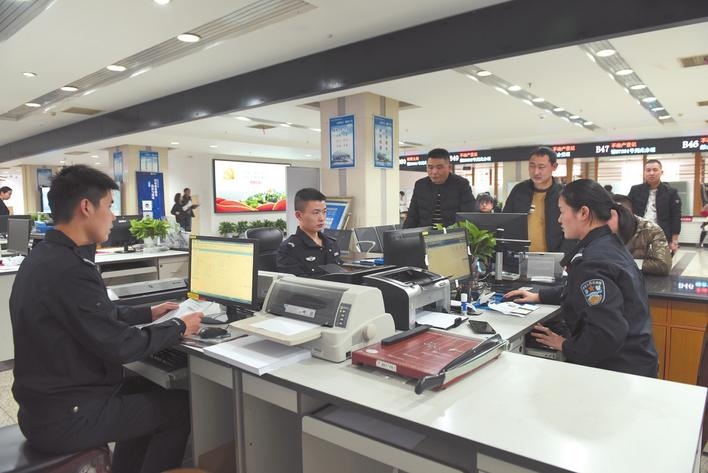 图为正在市政务服务中心办事大厅窗口办事的群众