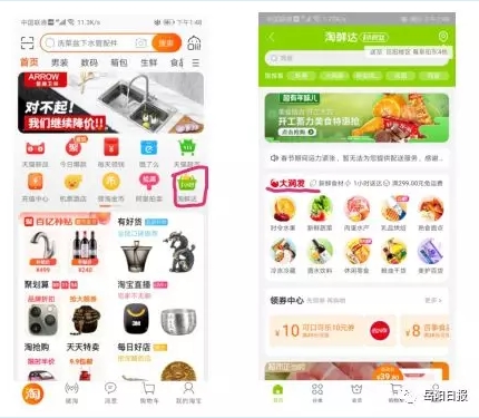 打开“手机淘宝”或 “天猫”APP,首页点击 “淘鲜达”进入购物界面,挑选商品并结算,注明配送地址后可配送上门,需加收配送费用(1小时内送达,满299元免配送费)。