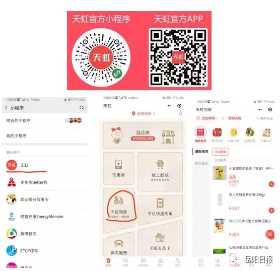手机微信扫描二维码,进入天虹小程序,进入界面选择天虹到家开始购物,“+”表示可选择,选择好商品后结算并确认配送地址即可送货上门。