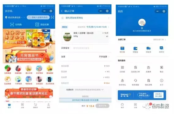 微信搜索并关注“沃尔玛”公众号可进入购物界面,挑选所需商品,挑选完进入结算界面并注明收货地址即可送货上门。