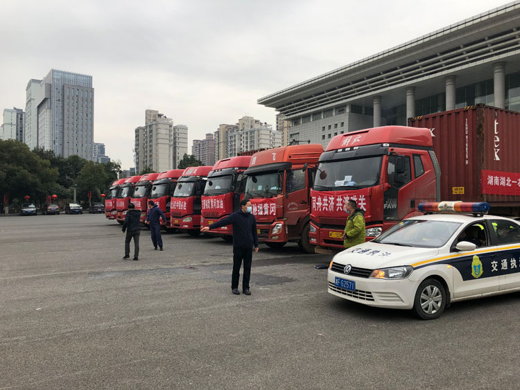 2月19日上午9时,8辆满载食品、蔬菜和水果等生活急需物资的大卡车从会展中心驶出,驰援湖北黄冈市,为黄冈人民送上紧缺物资。市委副书记、市长李爱武,副市长黎作凤,市政府秘书长刘传汉参加援赠启动仪式。