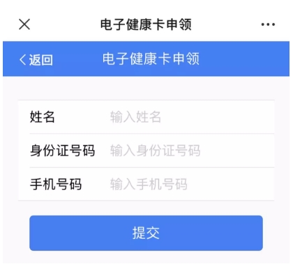 第五步,在电子健康卡申领页面填写姓名、身份证号码、手机号码之后提交。