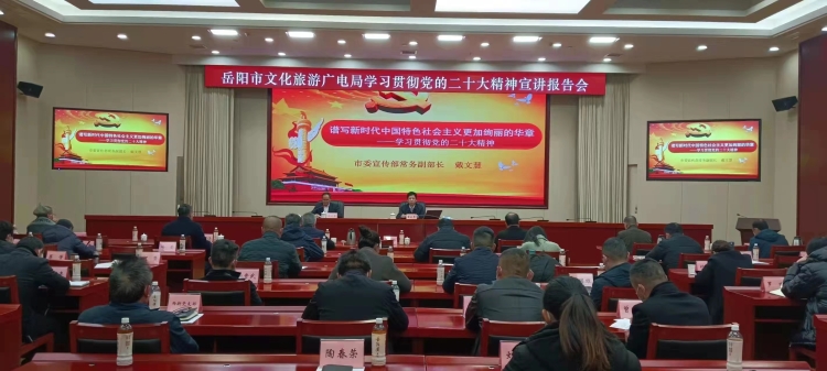 12月9日下午,市文旅广电局举行学习贯彻党的二十大精神宣讲报告会,中共岳阳市委宣传部常务副部长、市委宣讲团成员戴文慧专题宣讲。局党组书记汤文彬主持报告会。局机关全体党员干部、局直系统二级机构党政班子成员、局机关老干部党支部委员、局系统青年理论学习小组组长和局两新组织党支部书记等100余人参加学习。