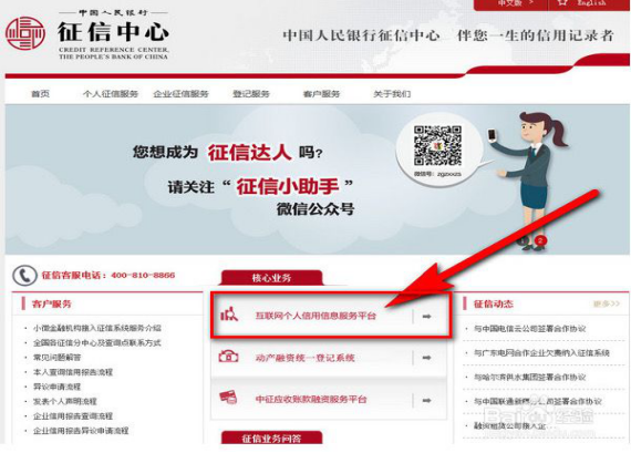第一步:进入征信中心官方网站, 点击“互联网个人信用信息服务平台”(http://www.pbccrc.org.cn)。