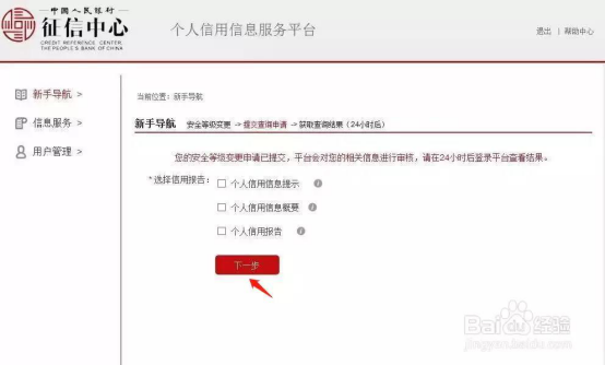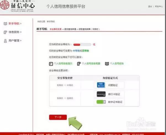 第四步:安全等级变更完成后, 在新页面选择“个人信用报告”,点击“下一步”。