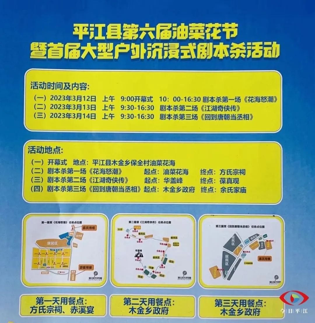 据了解,此次活动为期三天(3月12日至14日),既可以体验沉浸式的剧本杀带来的紧张刺激,又可以沿途观花赏景,体验乡村旅游带来的舒适惬意。还可以品尝当地美食,现场选购优质农产品。更有百名网红带您看花海,帮您推荐地道美食。让游客在游中玩,玩中尝。同时,还有汉服表演、以画会友、摄影大赛等一系列丰富多彩、引人入胜的主题活动,让游客有更新鲜、更多元的休闲娱乐体验。