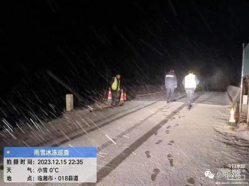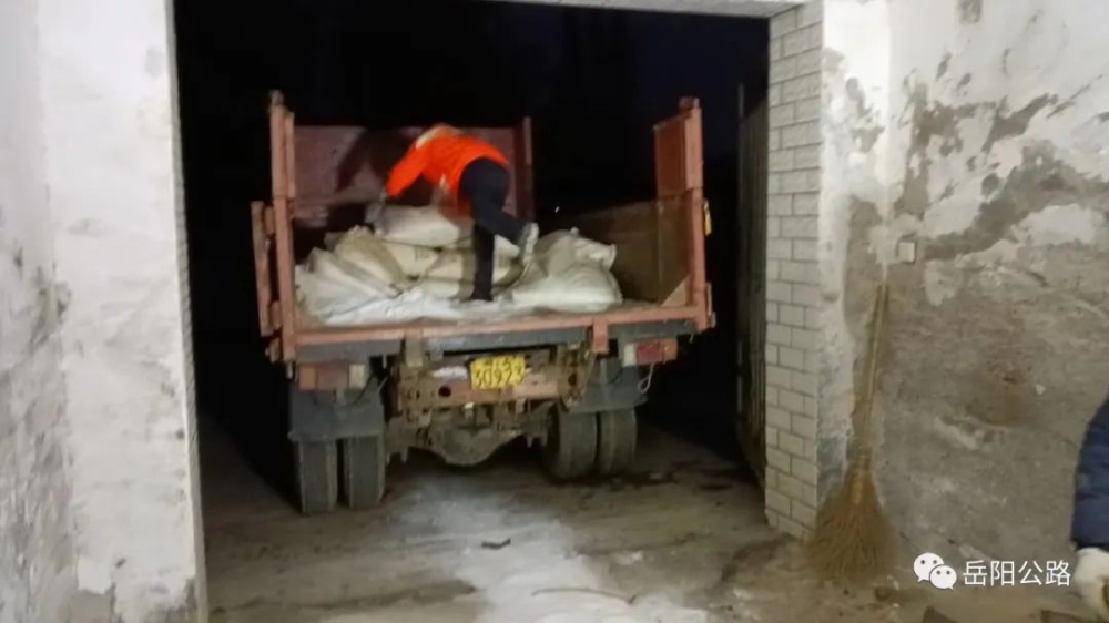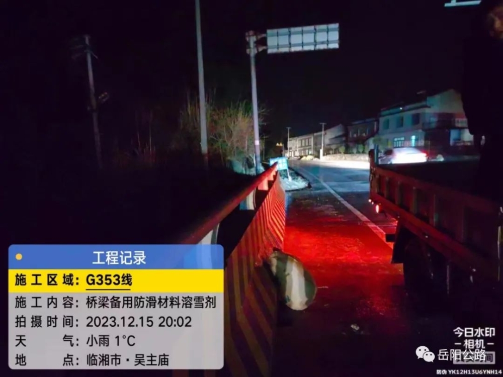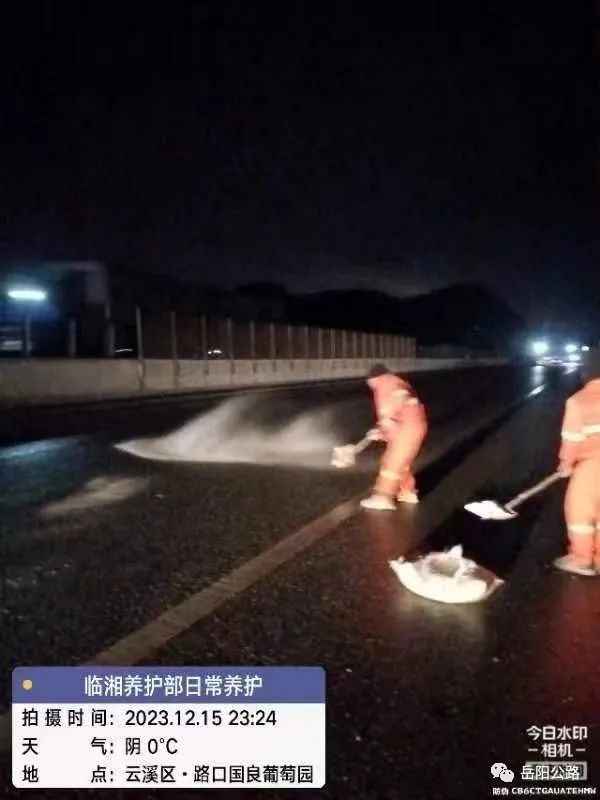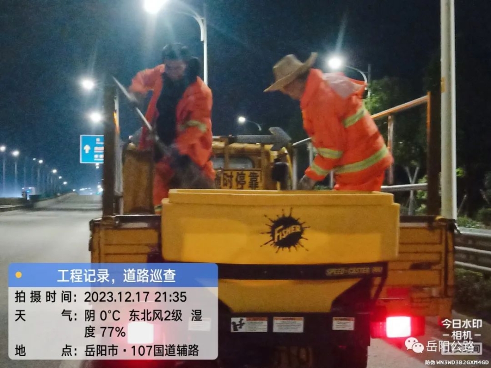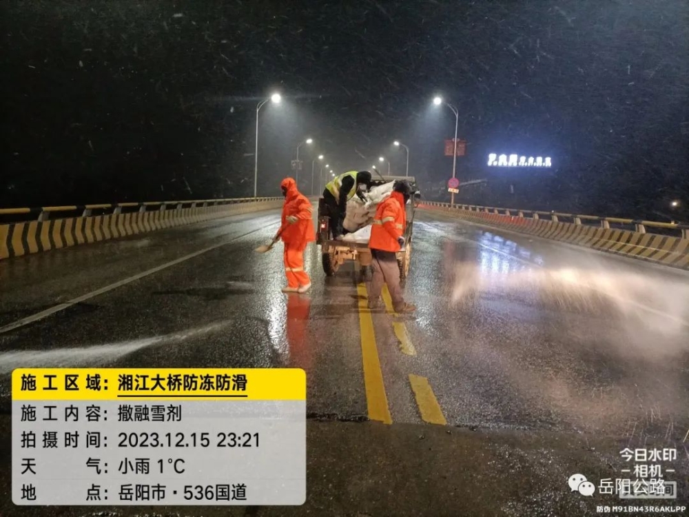 湘阴县公路建养中心开展抗冰保畅工作,夜间撒布融雪剂,防止桥面结冰。