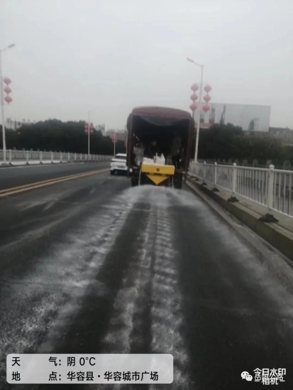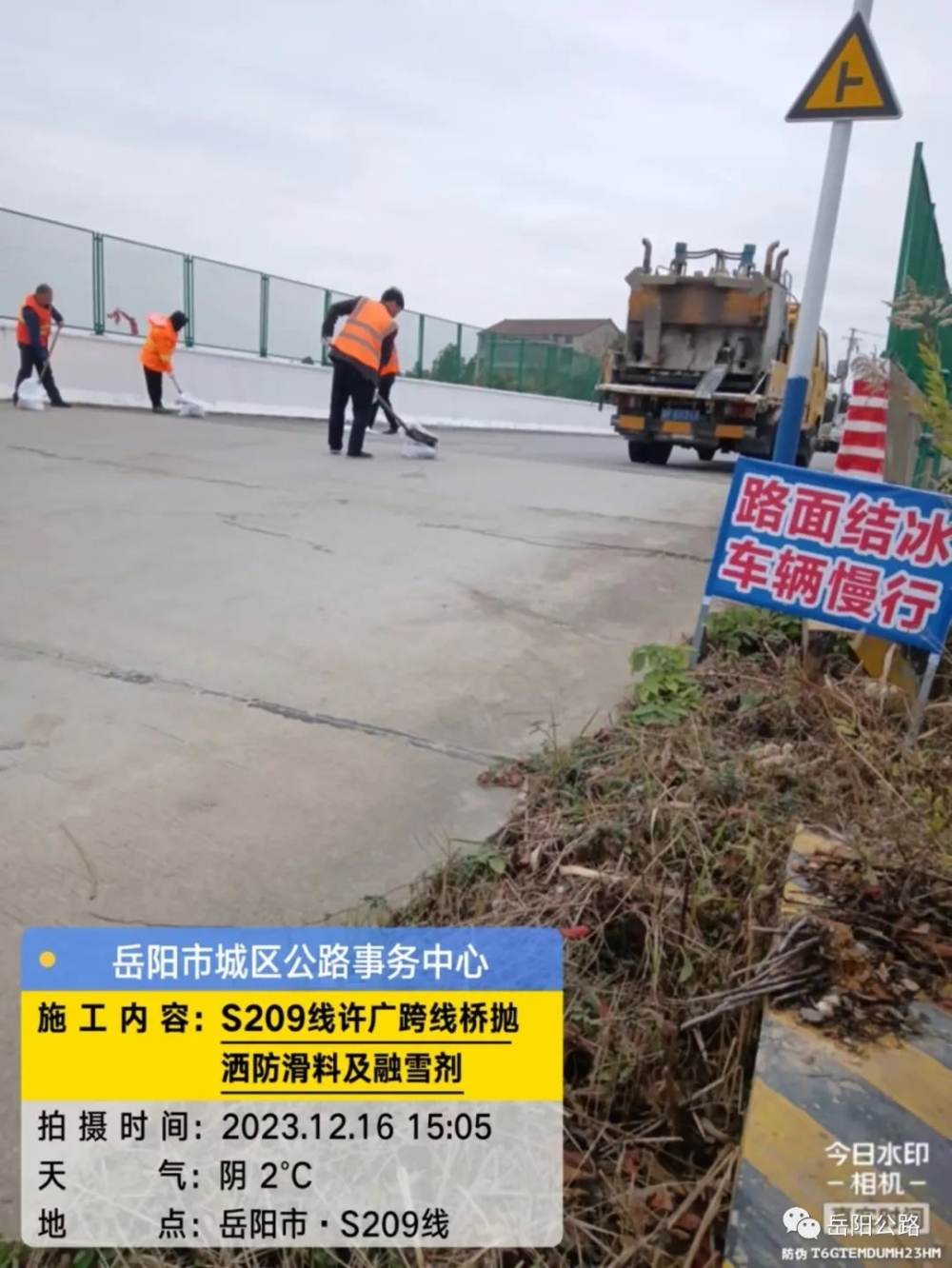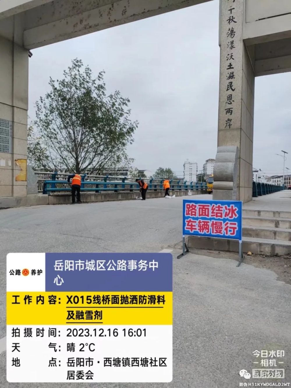 华容县公路事务中心组织人员开展路面清理工作,在全县重要桥梁撒布融雪剂。