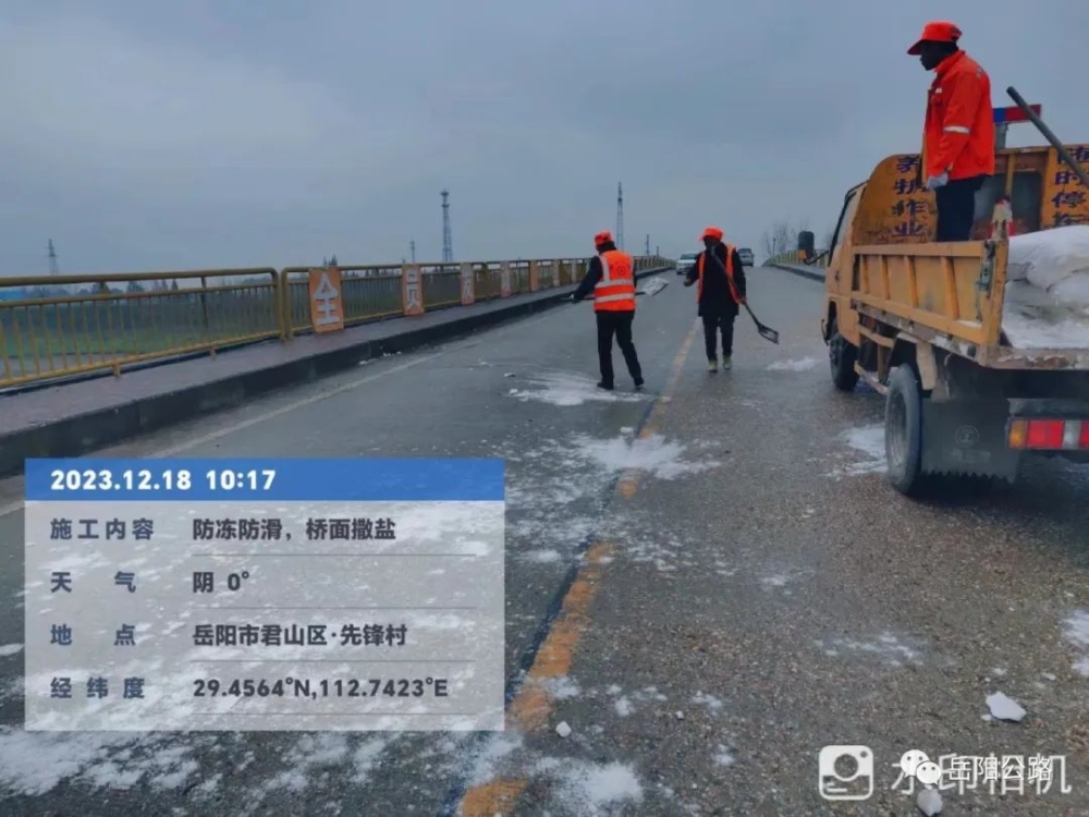 君山区公路建养中心启动国省干线应急预案,开展路面清理、抗冰保畅各项工作。