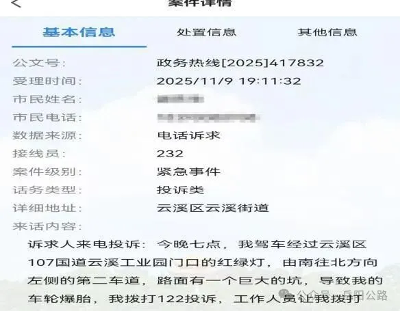 “群众利益无小事,一枝一叶总关情。”11月9日周日晚7点40分,岳阳市公路建设和养护中心接到12345热线“107国道云溪工业园门前有坑槽”紧急工单。尽管大雨滂沱、气温骤降,责任单位107国道养护中心坚持“雨天不降温、服务不打折”,立即启动应急预案,皇姑塘养护部5名“公路橙”5分钟内集结到位,调派车辆、冷再生补路设备,冒雨完成云溪工业园红绿灯处坑槽修补,并第一时间向市民反馈处置结果,用速度诠释温度。从接报到完成修复及回复市民,全程用时仅47分钟。