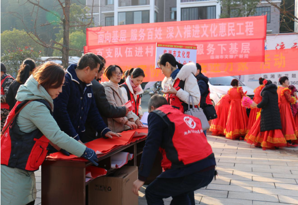 该市今年的活动部署早、跨度长、范围广、内容丰富,在全市范围内开展集“流动大戏台”、“草根大舞台”、“文化大讲堂”、“主题文化大展览”、“文化志愿者大比武”、“少儿才艺大展演”等多项活动于一体,老、少、中、青全民参与,城区、镇街、社区、屋场“遍地开花”,鲜明的时代主题、浓郁的乡土气息、多彩的表现形式贯穿了每一场演出,独具临湘特色的“草根文化”集中展示,让百姓大饱眼福。主会场活动当天,为百姓送图书2000册、送春联500幅、还为贫困户送去了大米和食用油,乡村群众从中听见了党的声音,深切感受到了党的亲切关怀,文艺工作者在走基层中汲取了鲜活的地气给养。