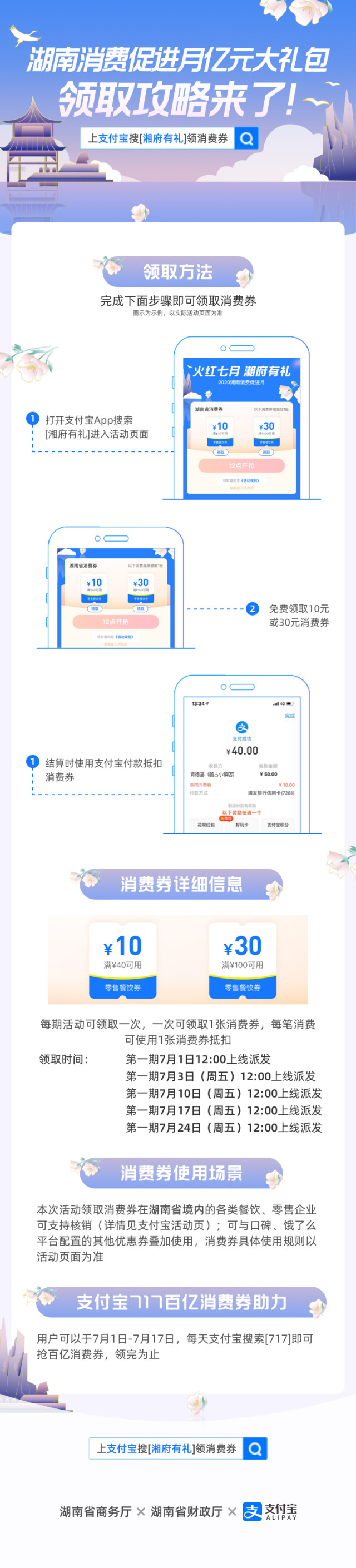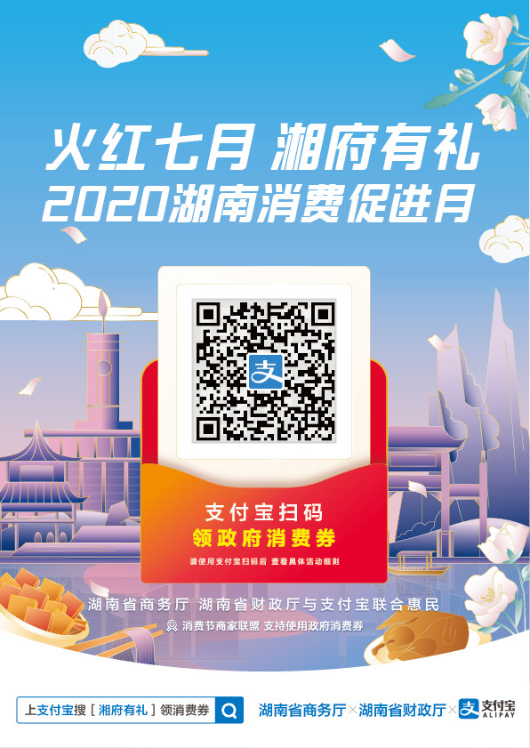 新湖南客户端6月27日讯(记者 彭可心 通讯员 黄颀杨)为扩大内需,推动消费回升,记者今日从湖南省商务厅了解到,省商务厅、省财政厅将于7月1日起,联合相关部门、支付平台以及商家企业,共同推出“火红七月 湘府有礼”湖南消费促进月活动。主体活动将通过阿里巴巴支付宝平台,以发放零售、餐饮电子消费券形式实施,累计发放消费券亿元以上,预计将带动相关消费十亿元以上。