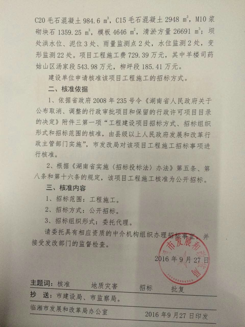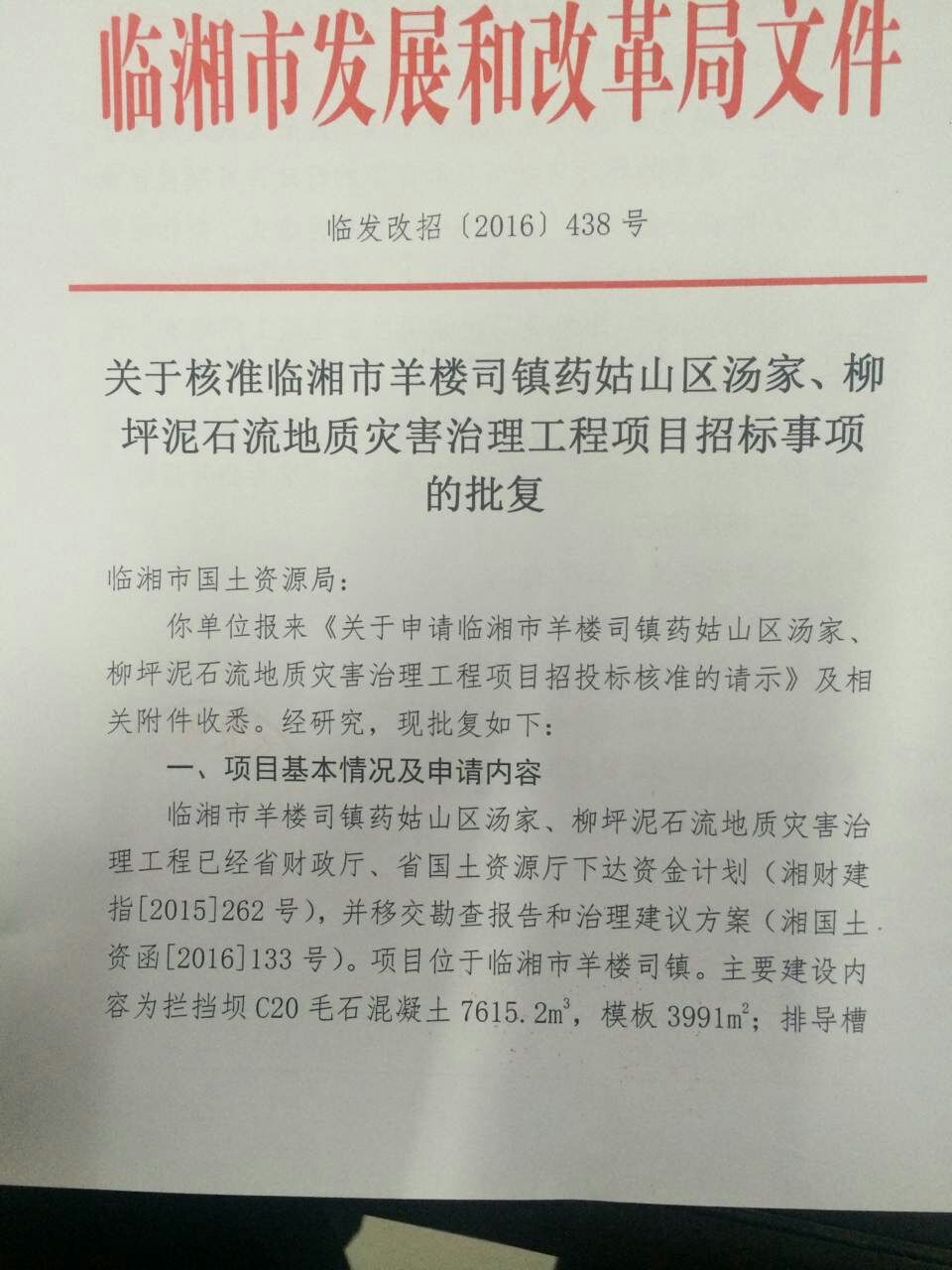1、项目名称:临湘市羊楼司镇药姑山区汤家、柳坪泥石流地质灾害治理工程项目;