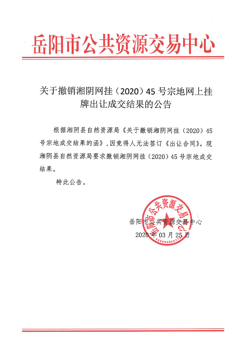 关于撤销湘阴网挂(2020)45号宗地网上挂牌出让成交结果的公告