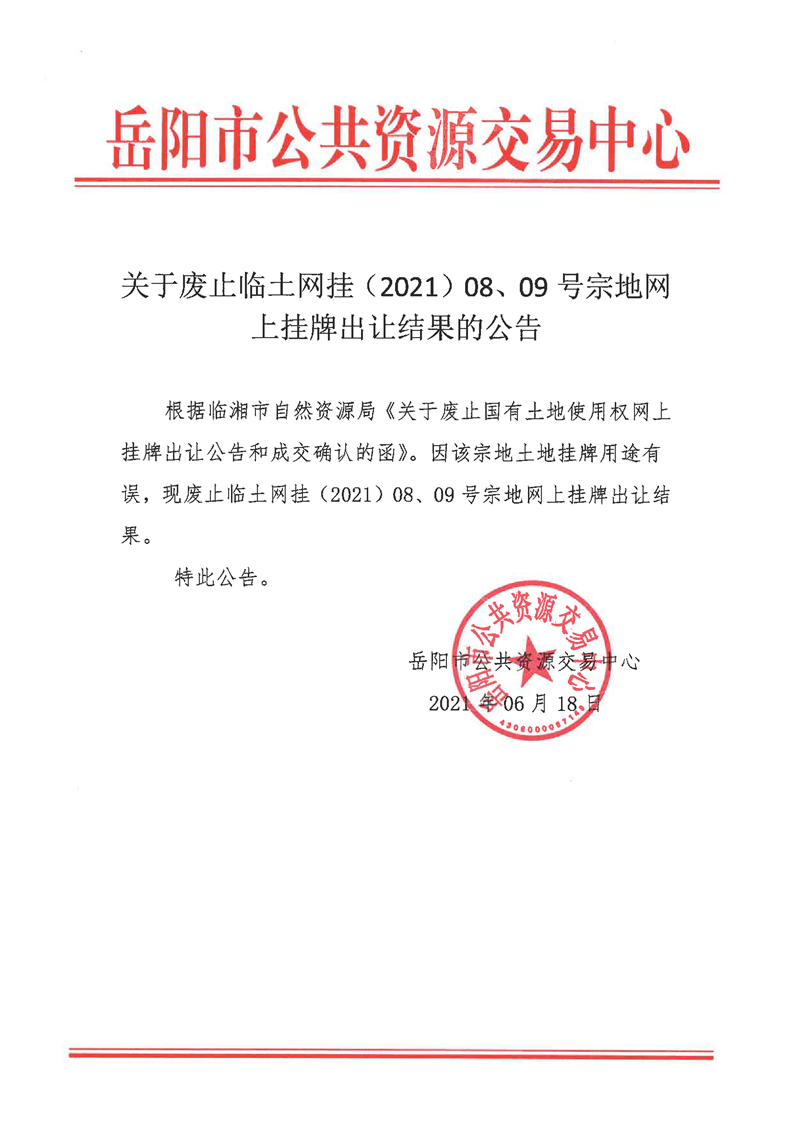 关于废止临土网挂(2021)08、09号宗地网上挂牌出让结果的公告