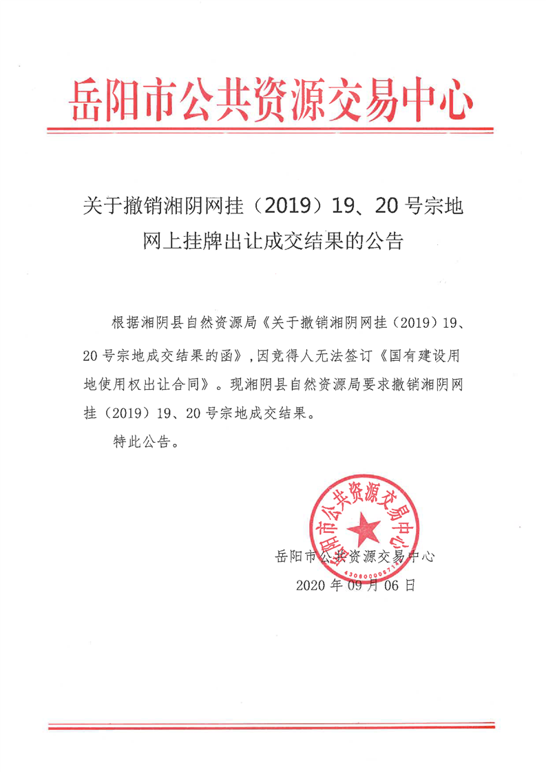 关于撤销湘阴网挂(2019)19、20号宗地网上挂牌出让成交结果的公告