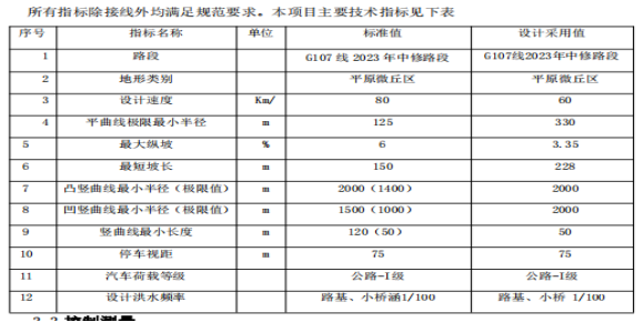 2.2、项目建设规模及招标范围:G107线项目起点为新墙镇,终点为黄柏镇,沿线经过的主要控制点为G107为黄柏镇;主线全长为10.367公里(支线长 / 公里),按II级公路标准、设计速度60公里/小时建设,路基宽12米,路面为沥青砼路面, 宽12米,桥涵设计荷载为公路II(I 或Ⅱ)级。