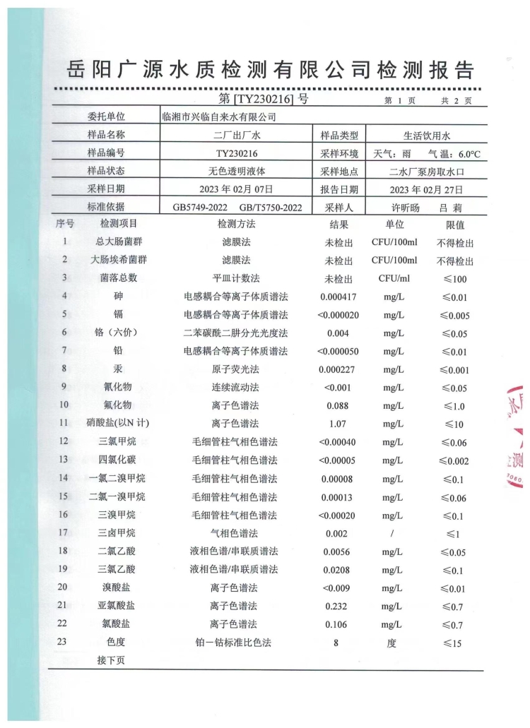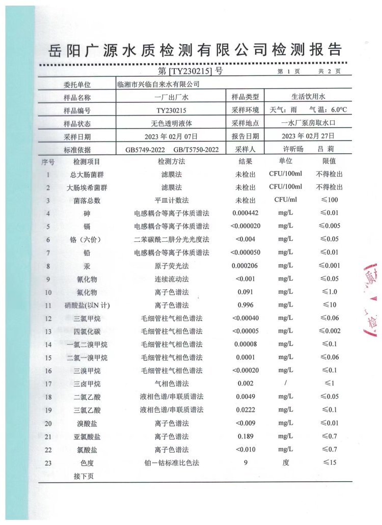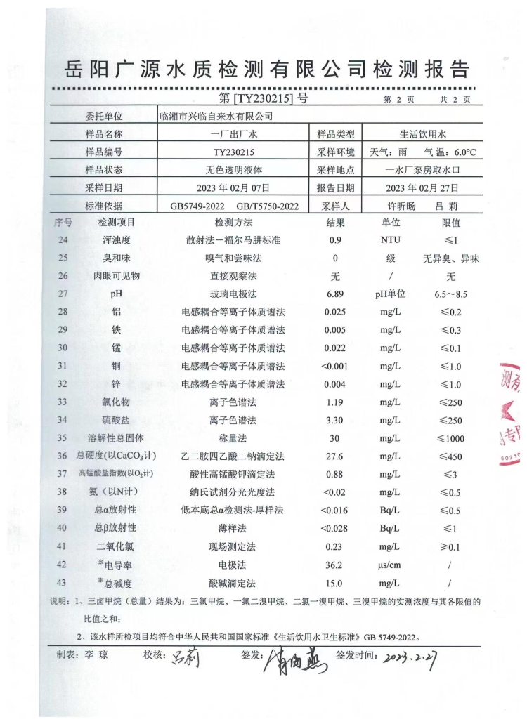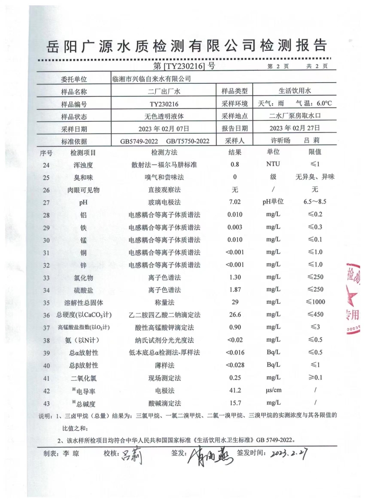 2023年2月临湘市兴临自来水有限公司出厂水水质检测月报表(图)