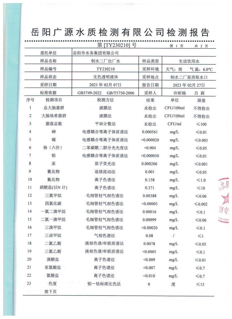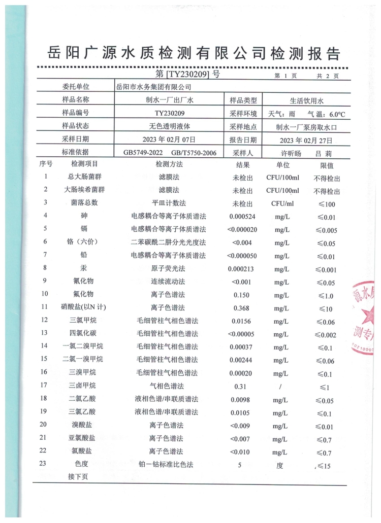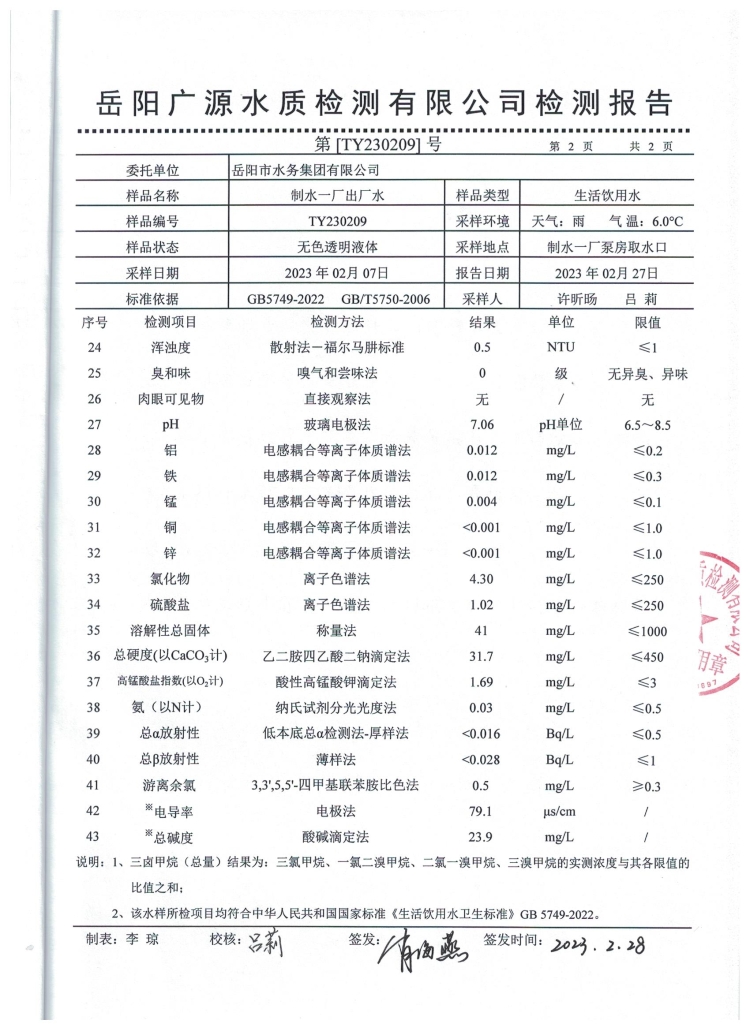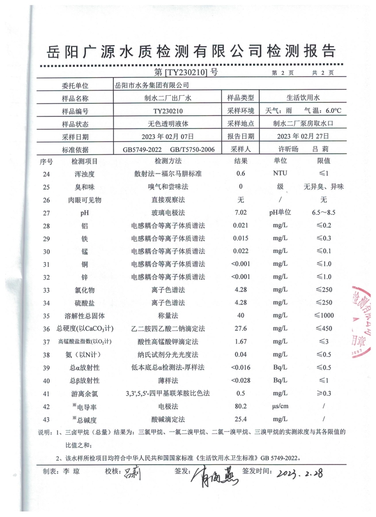 2023年2月岳阳市水务集团出厂水水质检测月报表