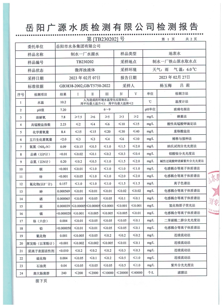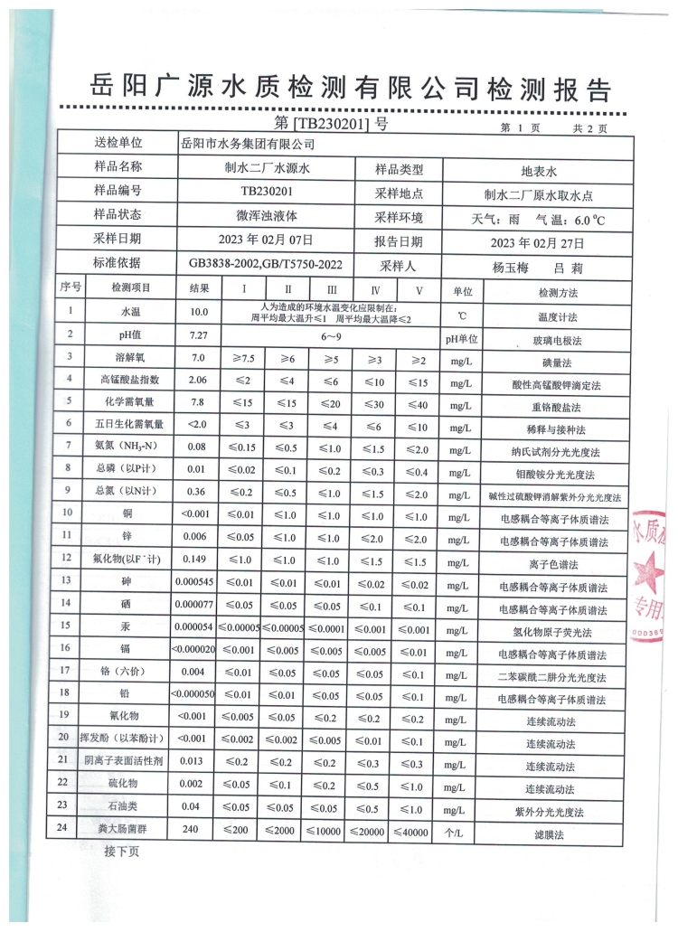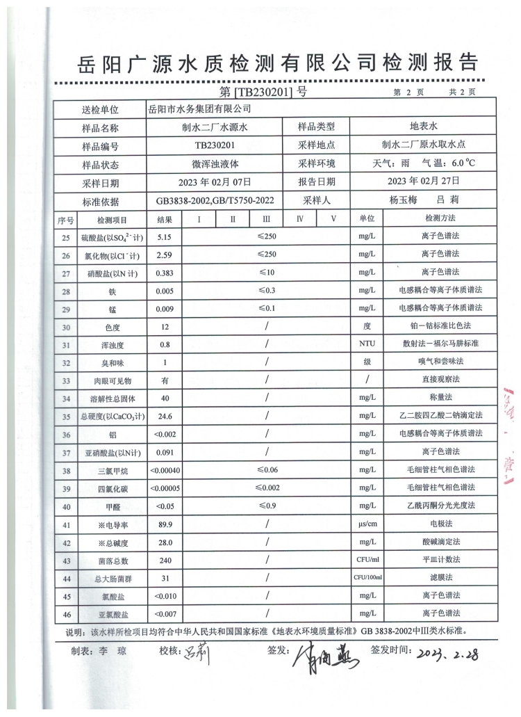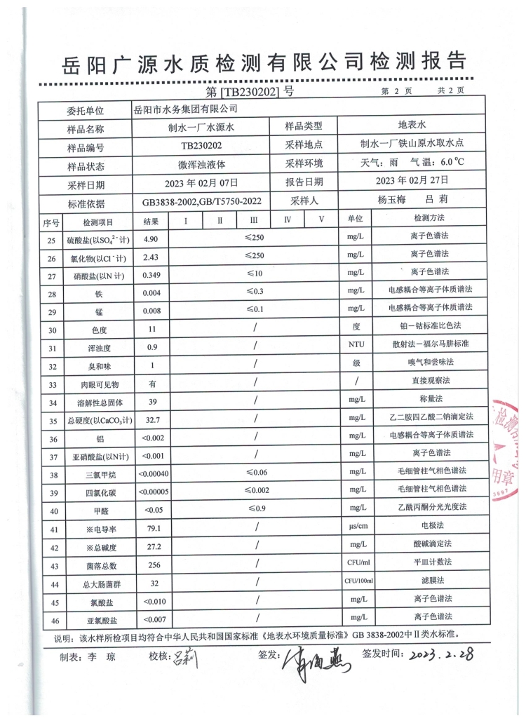 2023年2月岳阳市水务集团水源水水质检测月报表