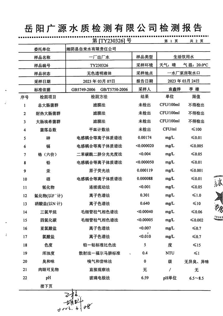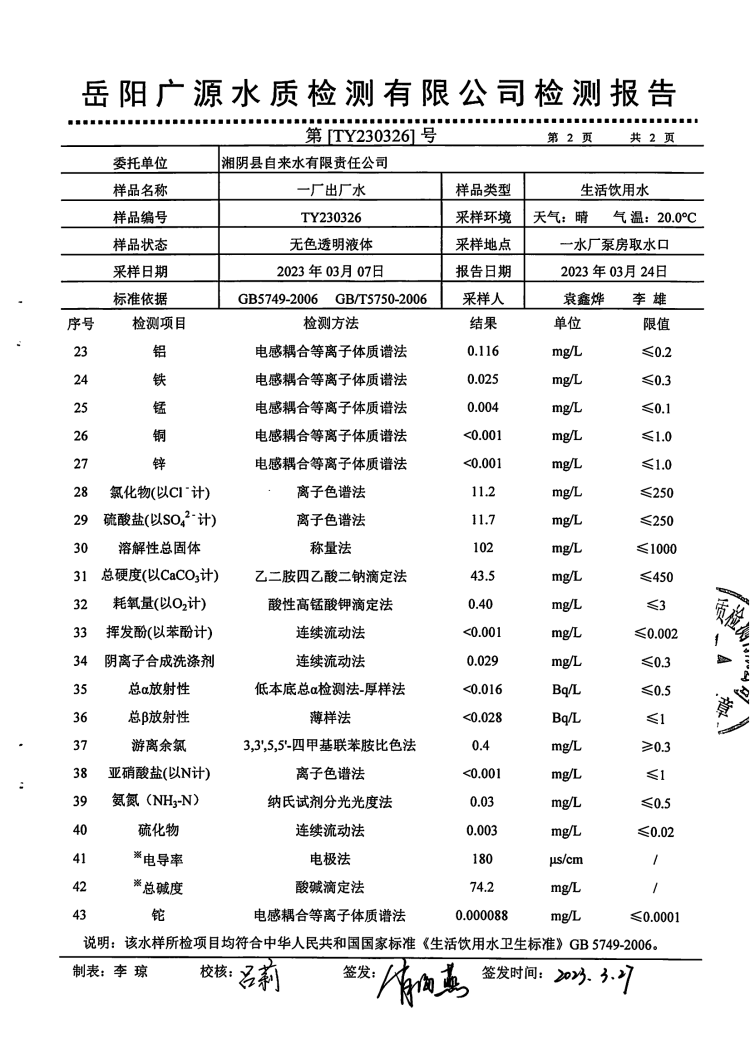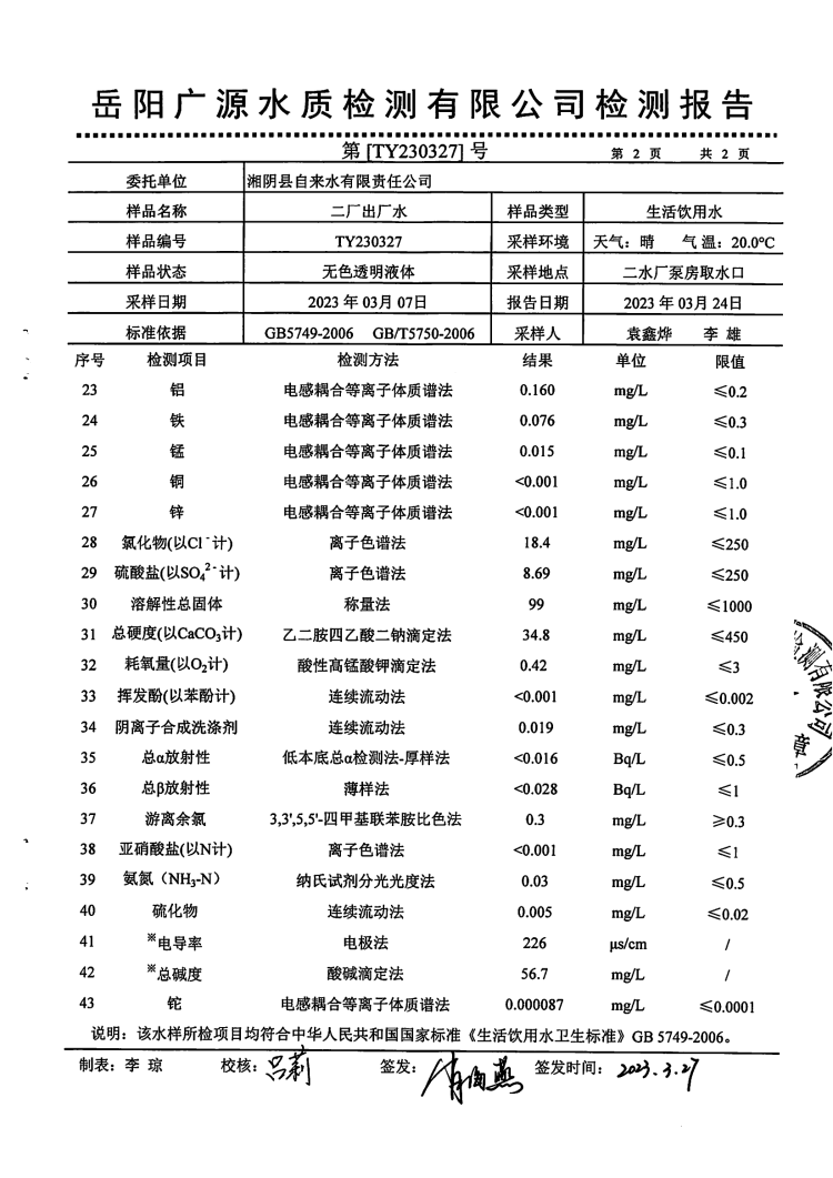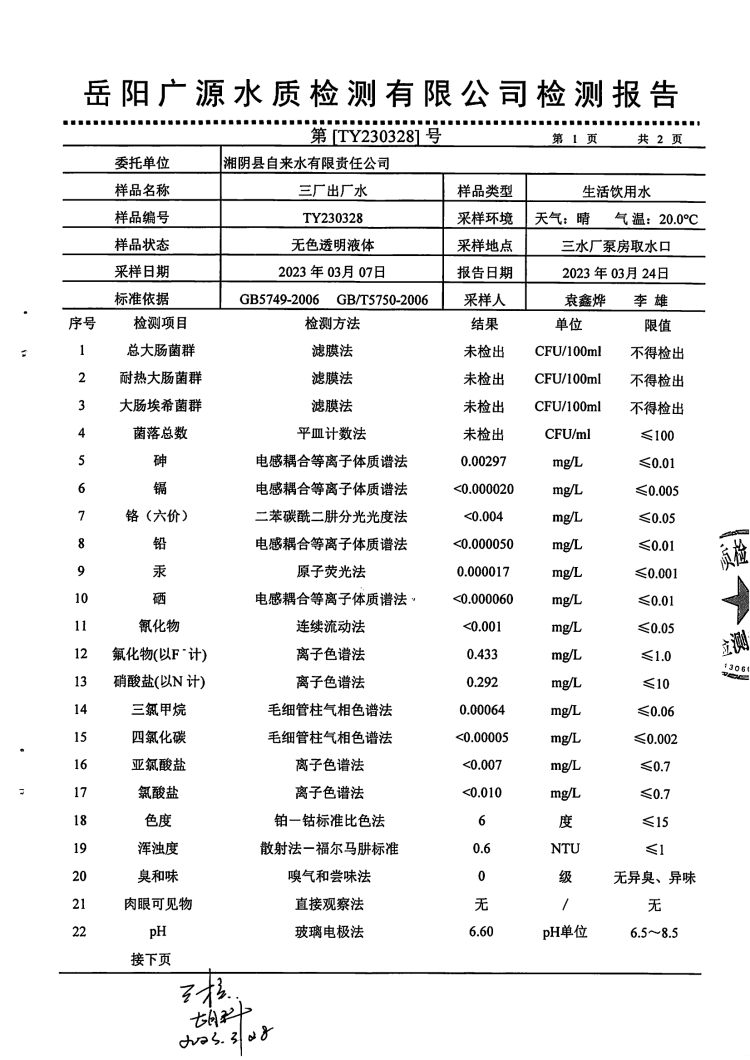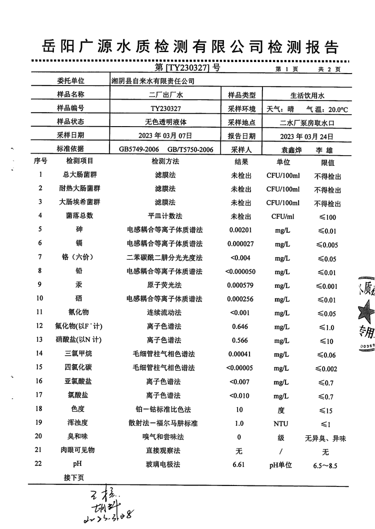 2023年3月湘阴县自来水有限责任公司出厂水水质检测月报表