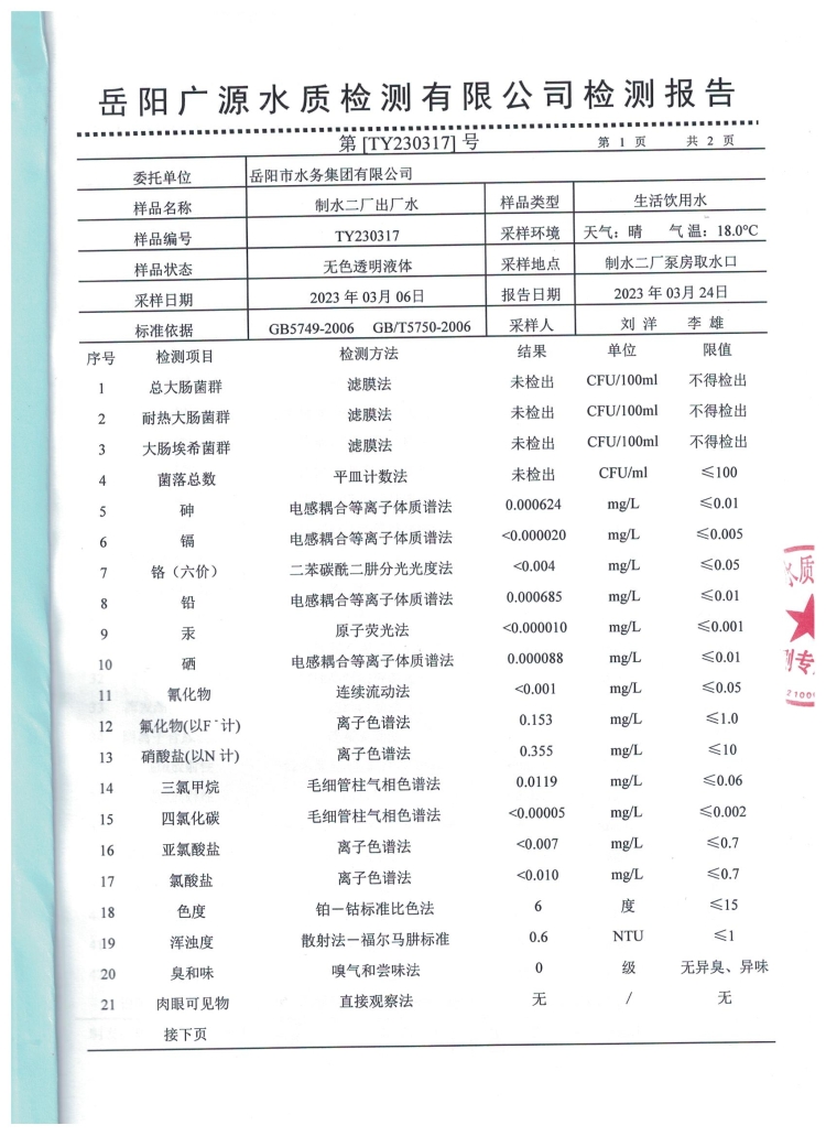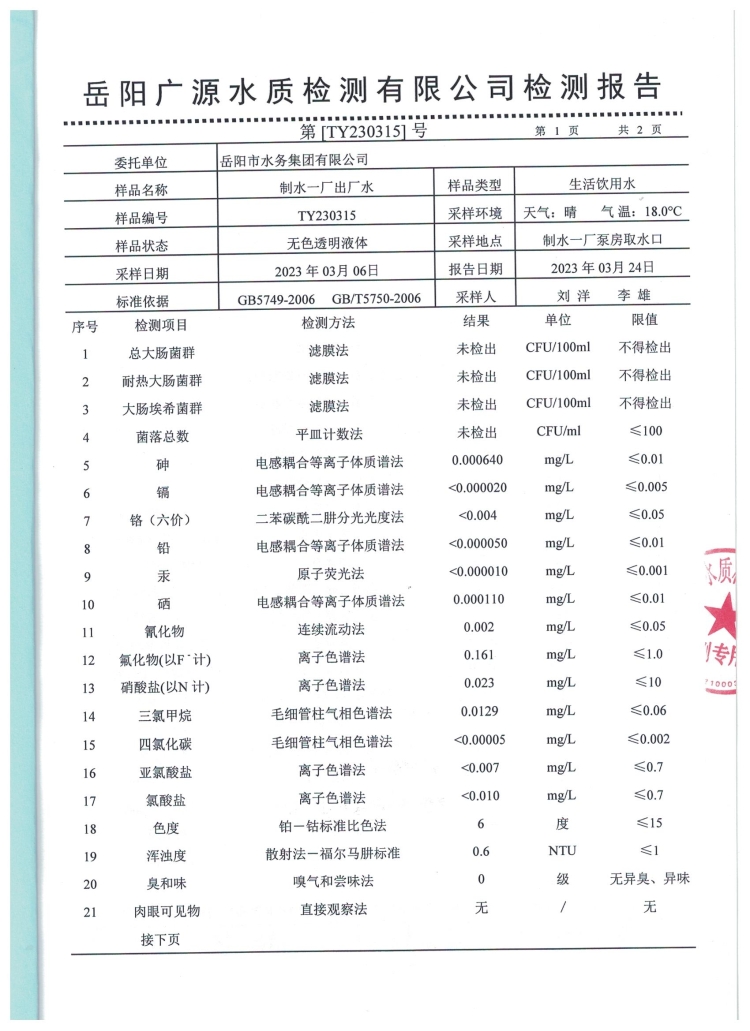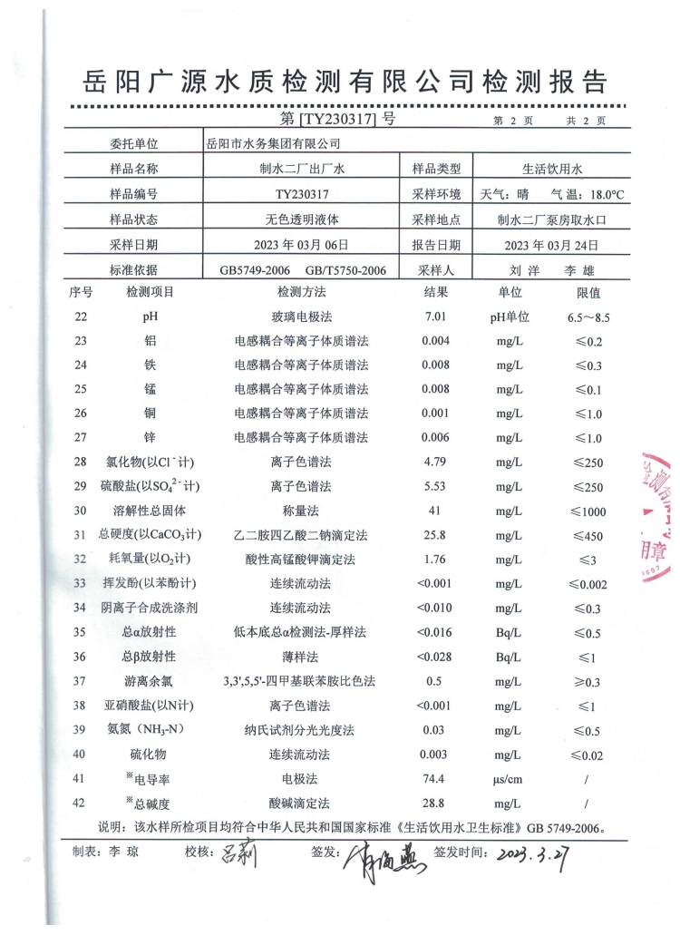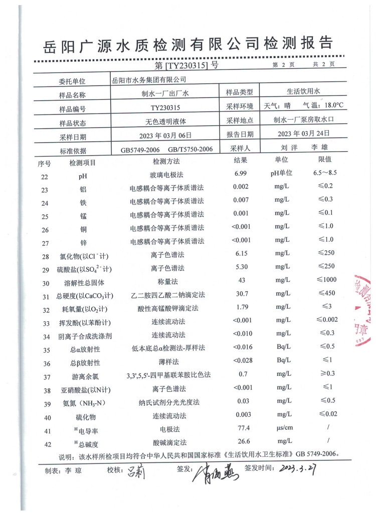 2023年3月岳阳市水务集团出厂水水质检测月报表