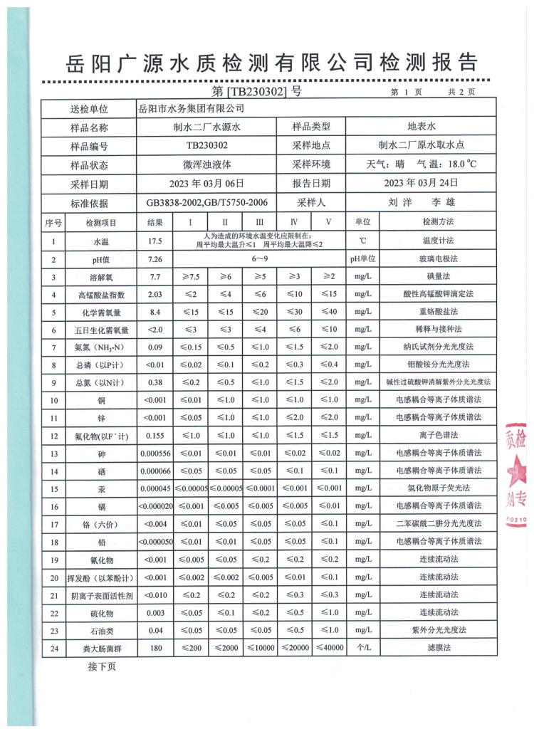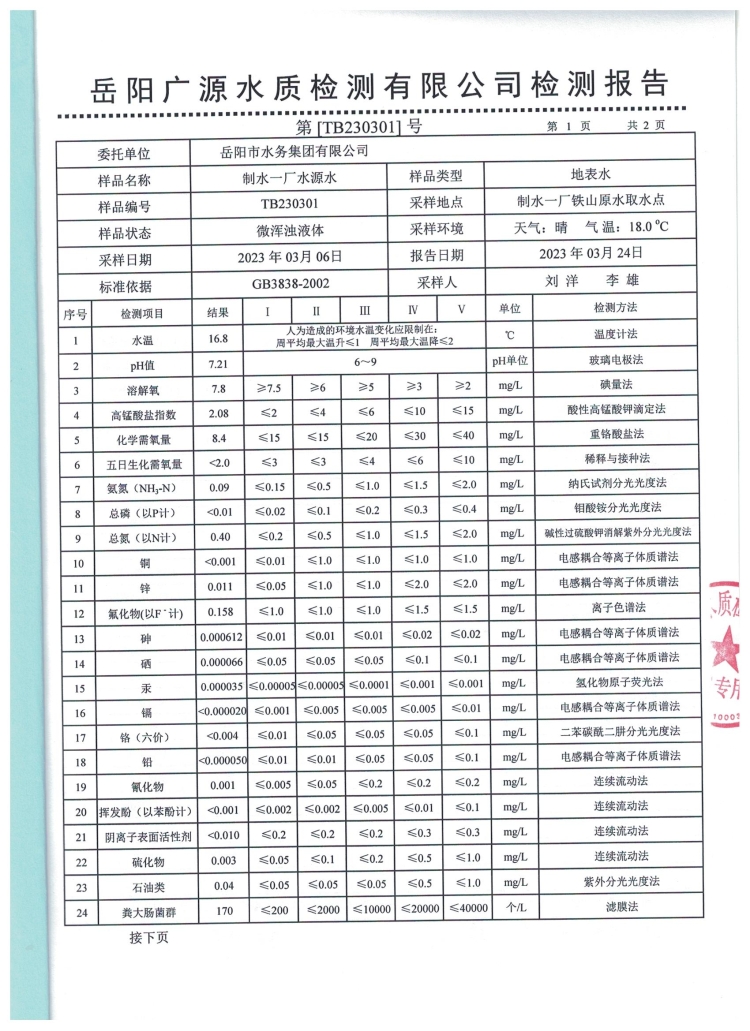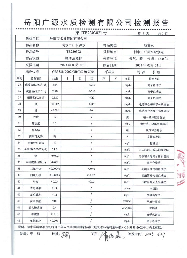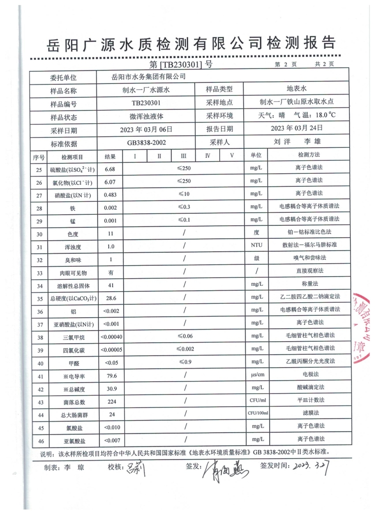 2023年3月岳阳市水务集团水源水水质检测月报表