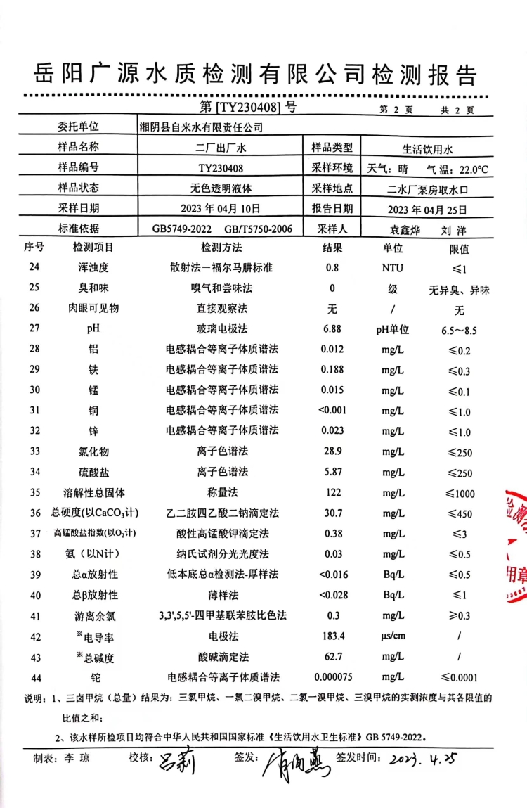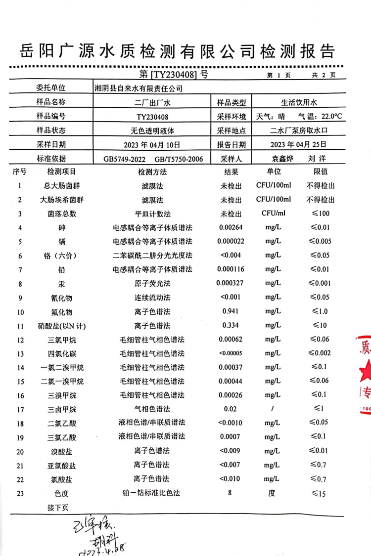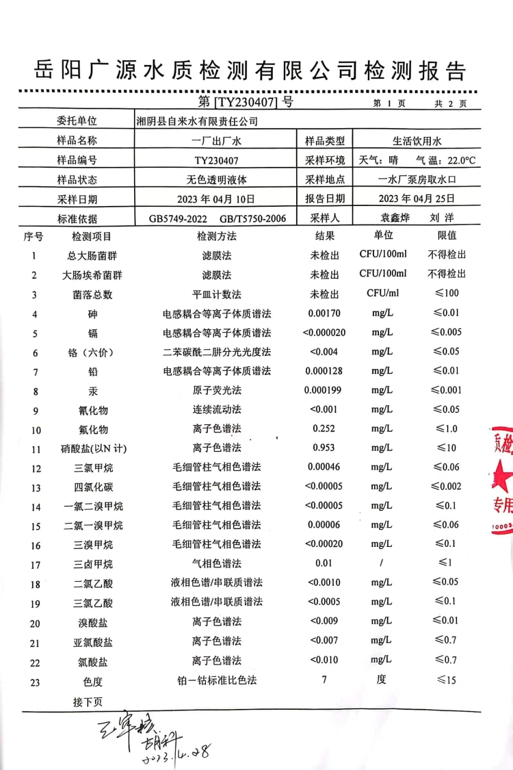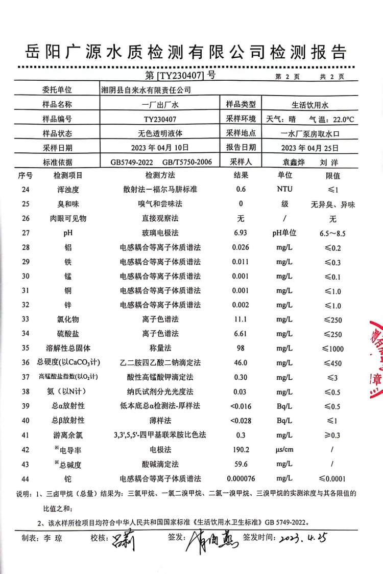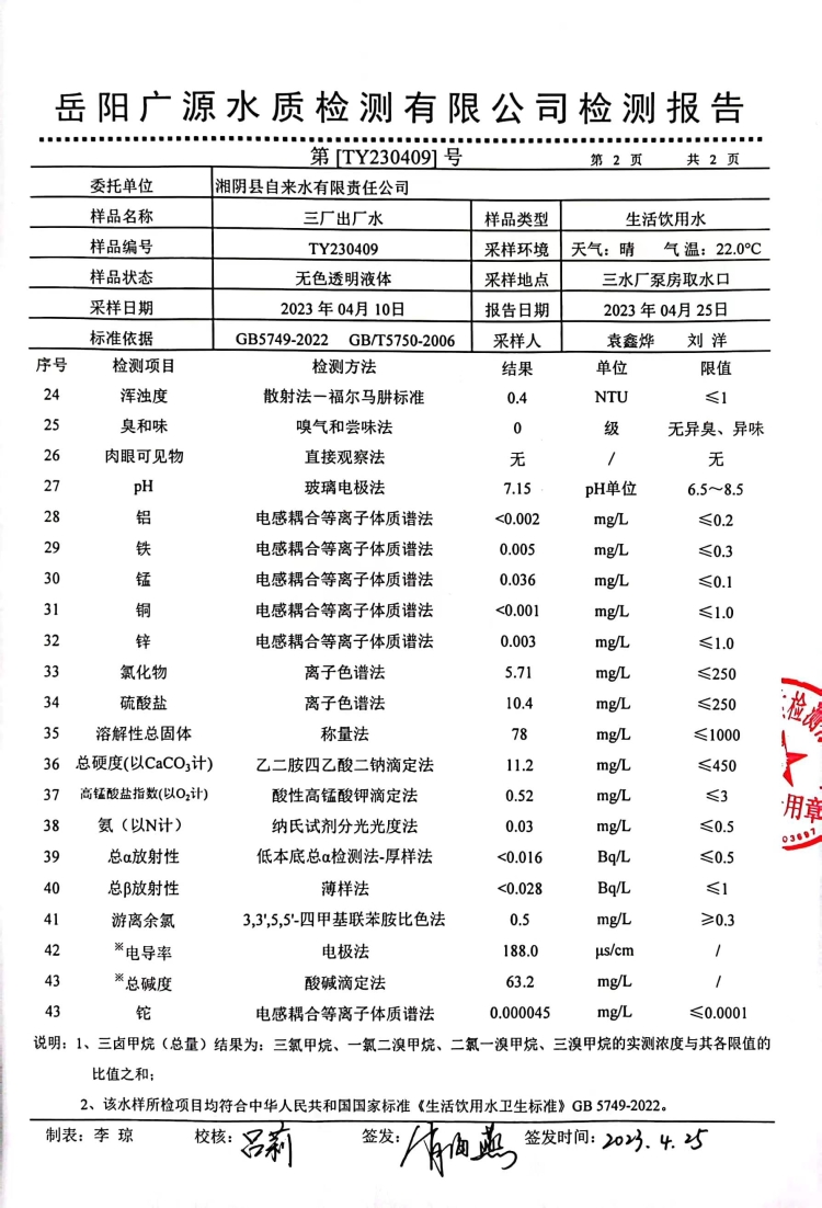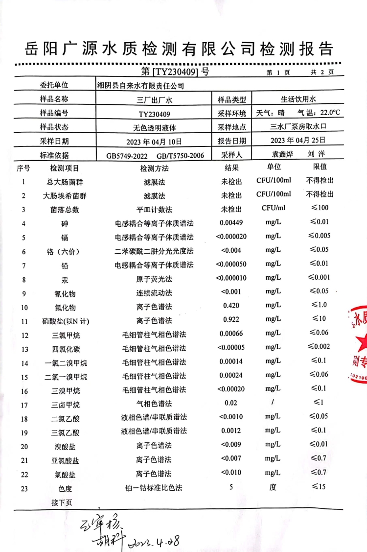 2023年4月湘阴县自来水有限责任公司出厂水水质检测月报表