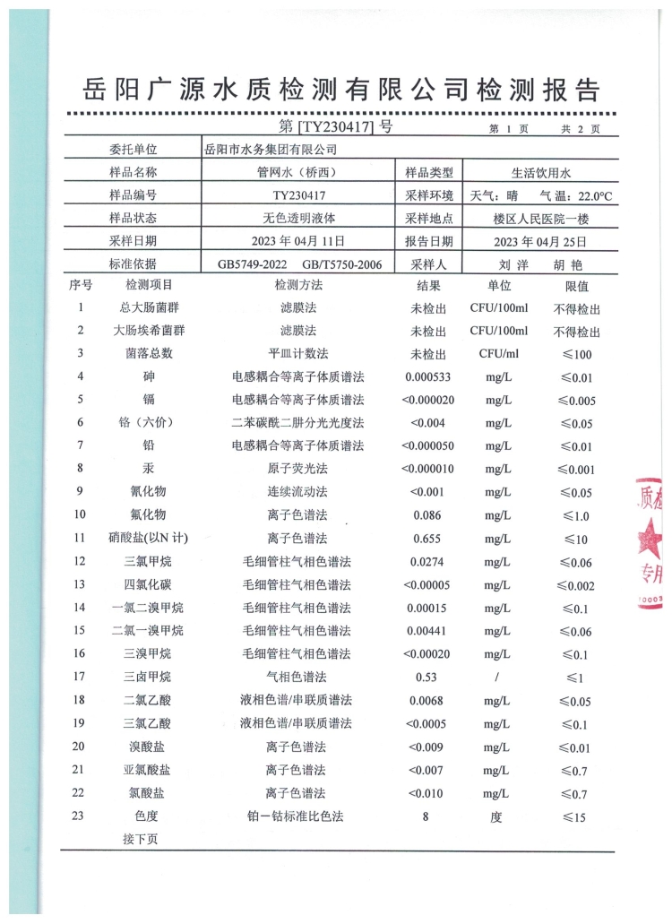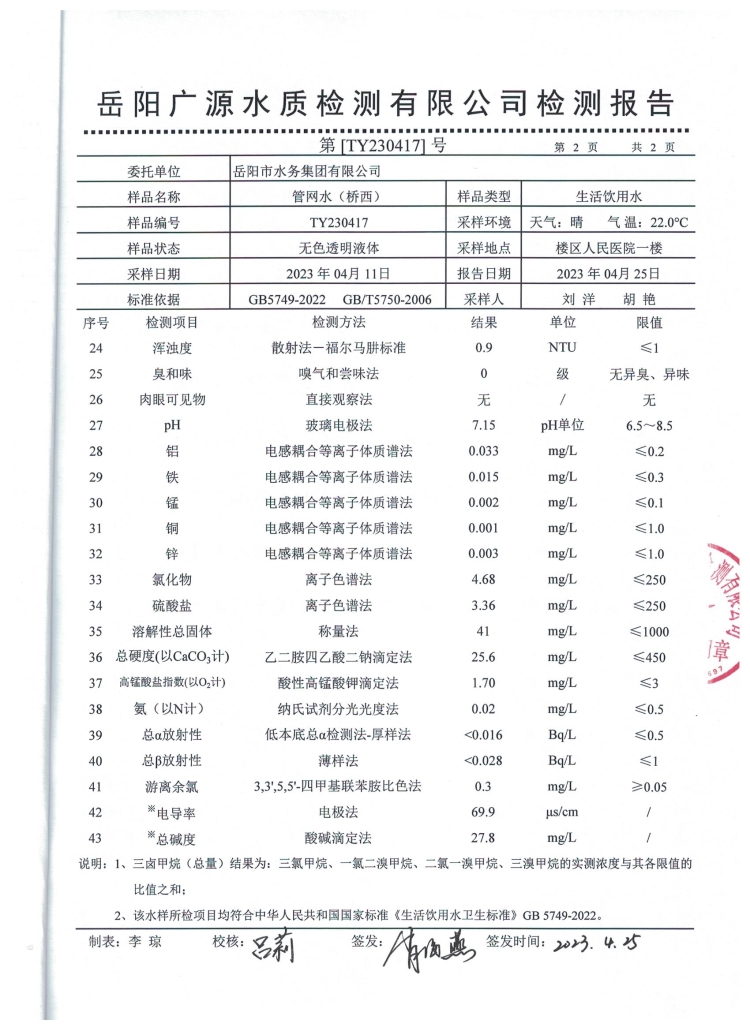 2023年4月岳阳市水务集团管网水水质检测月报表