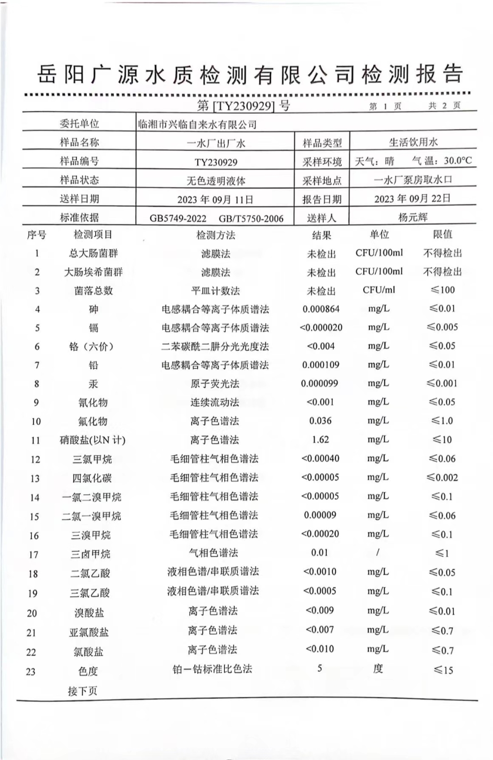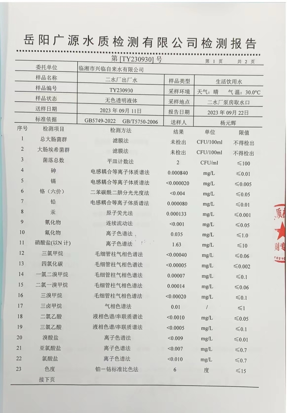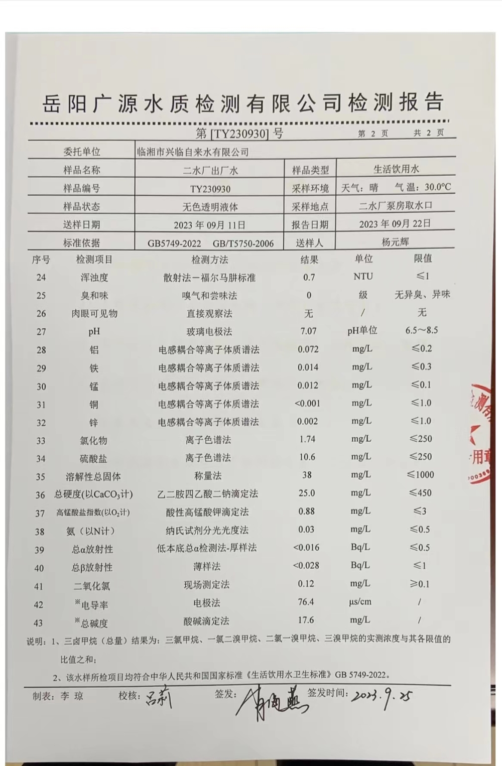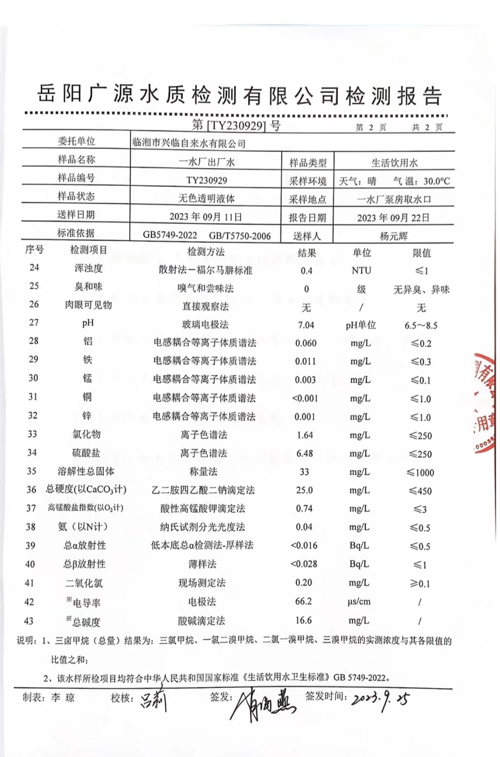 2023年9月临湘市兴临自来水有限公司出厂水水质检测月报表(图)