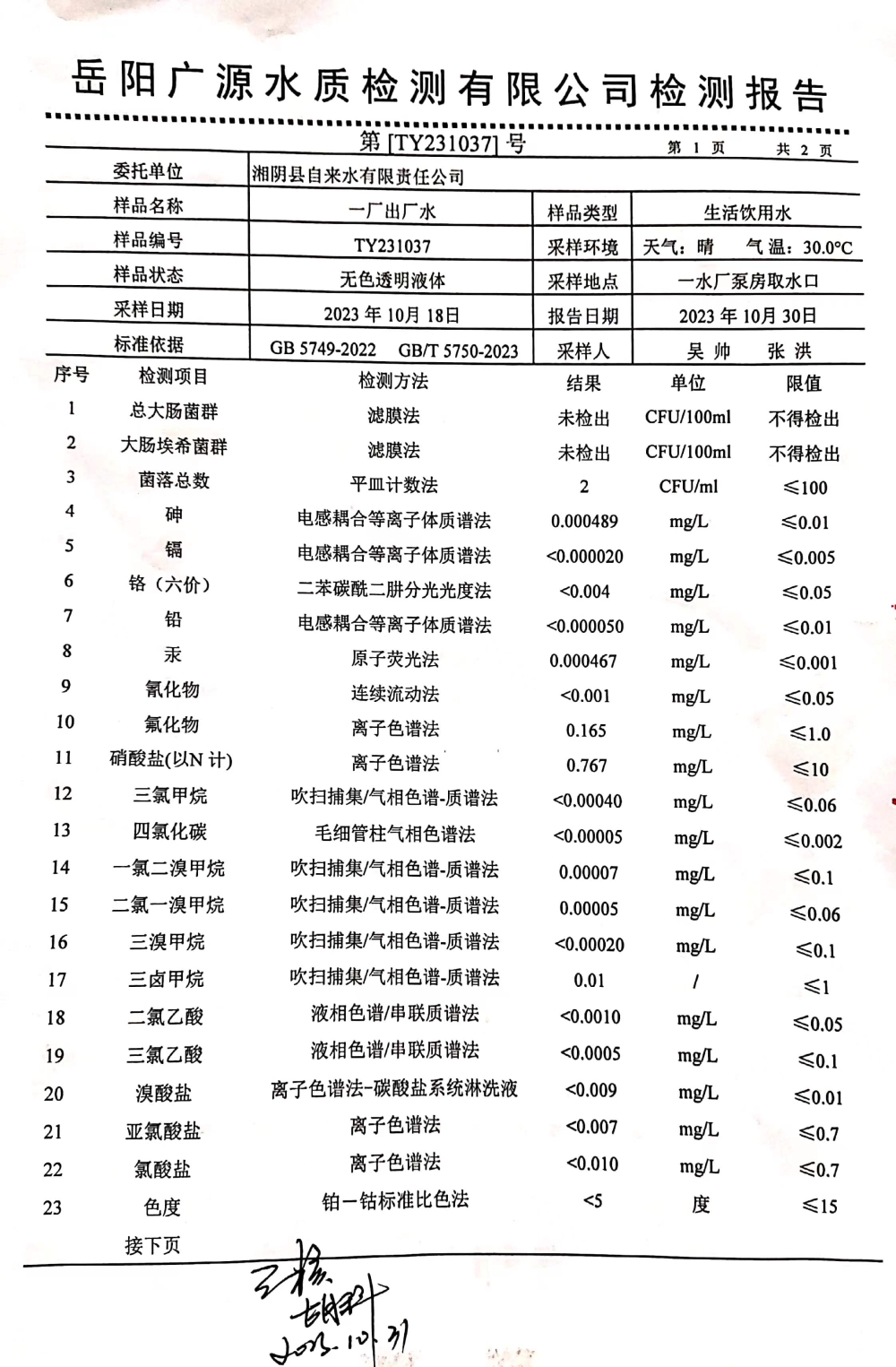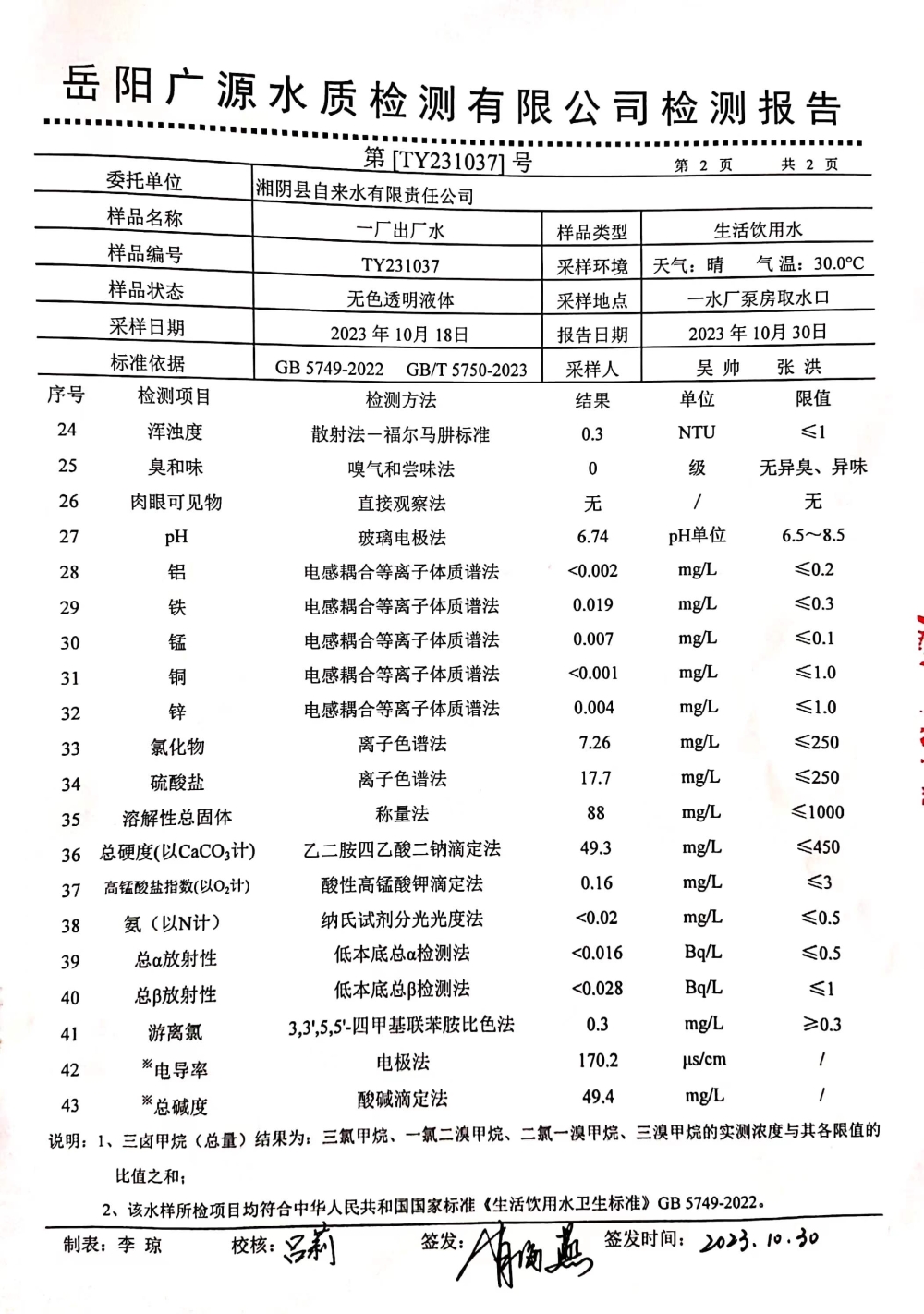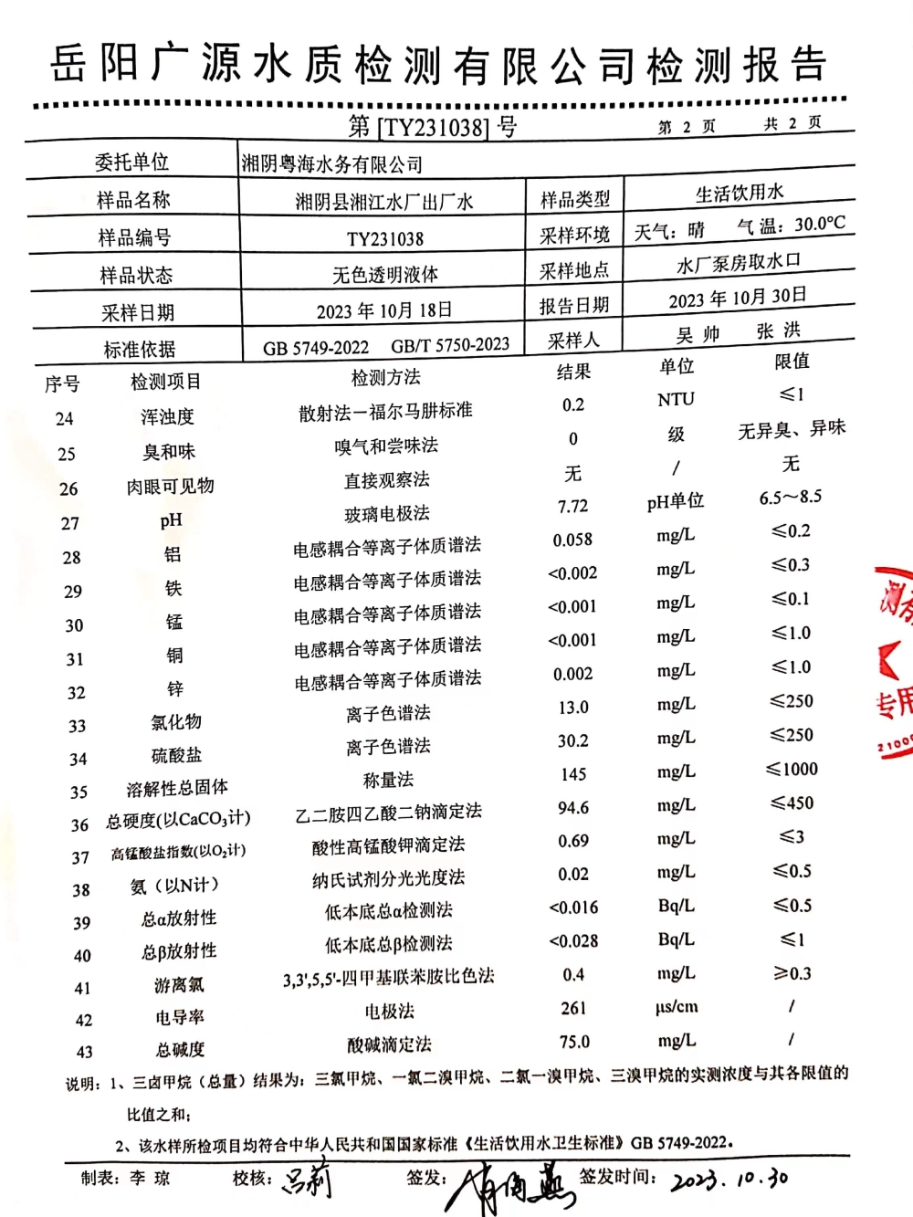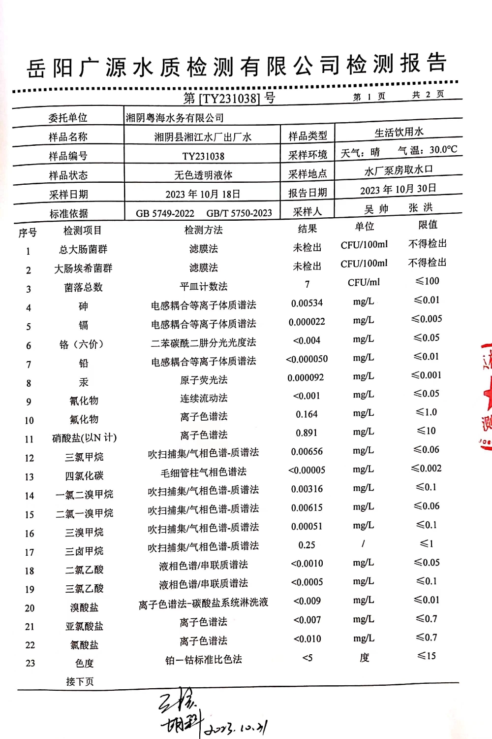 2023年10月湘阴县自来水有限责任公司出厂水水质检测月报表