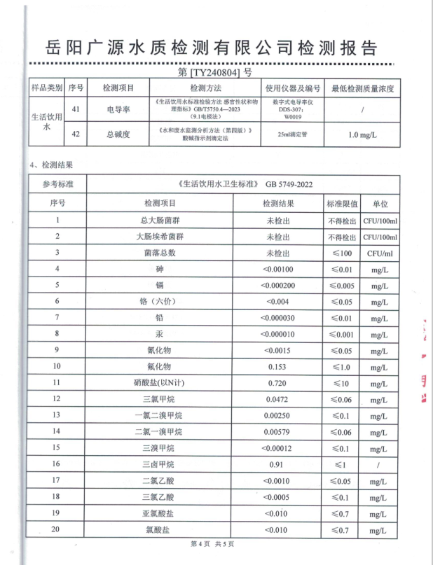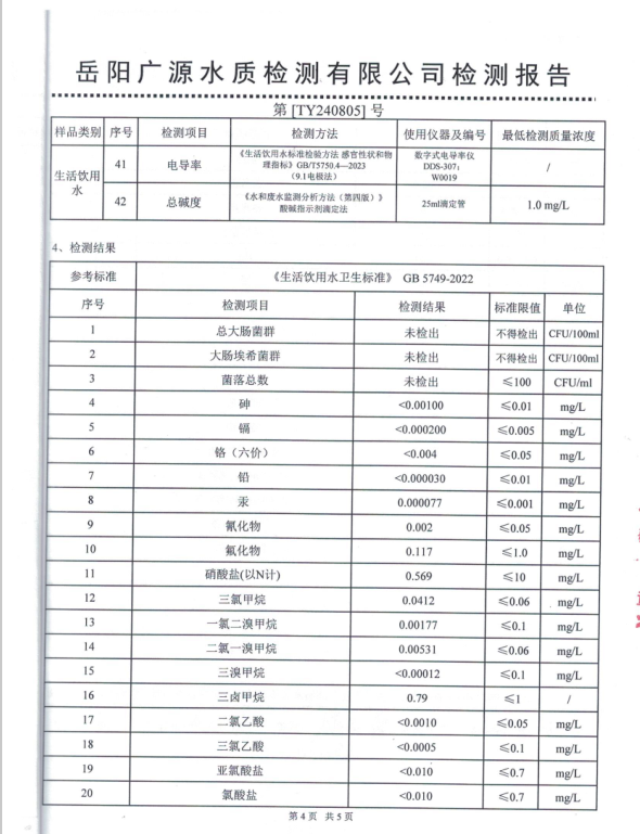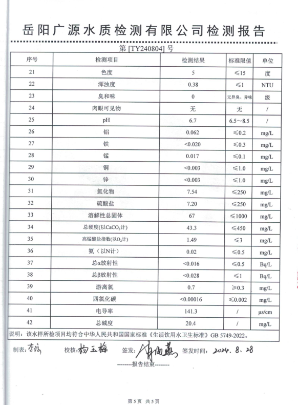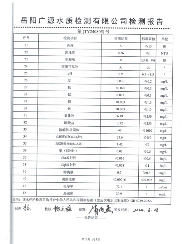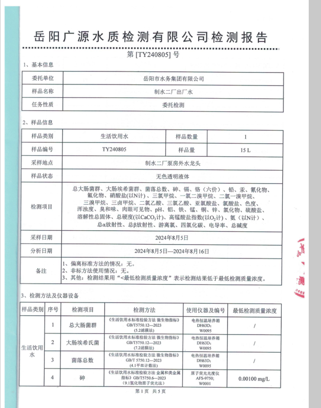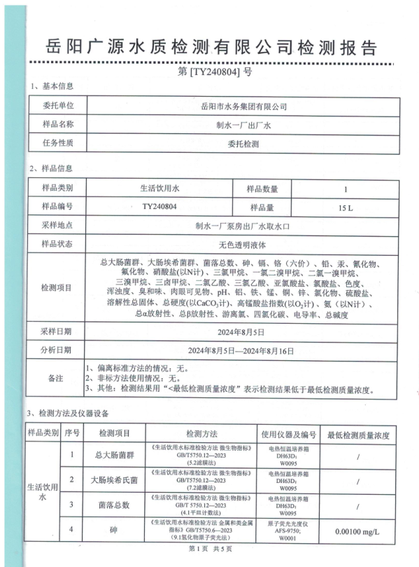 2024年8月岳阳市水务集团出厂水水质检测月报表