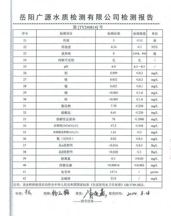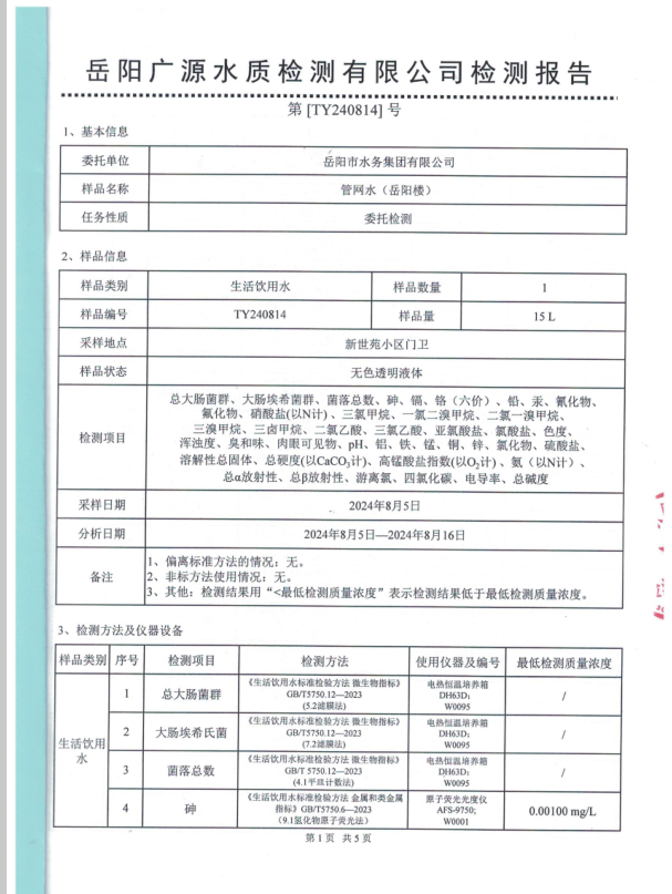 2024年8月岳阳市水务集团管网水水质检测月报表