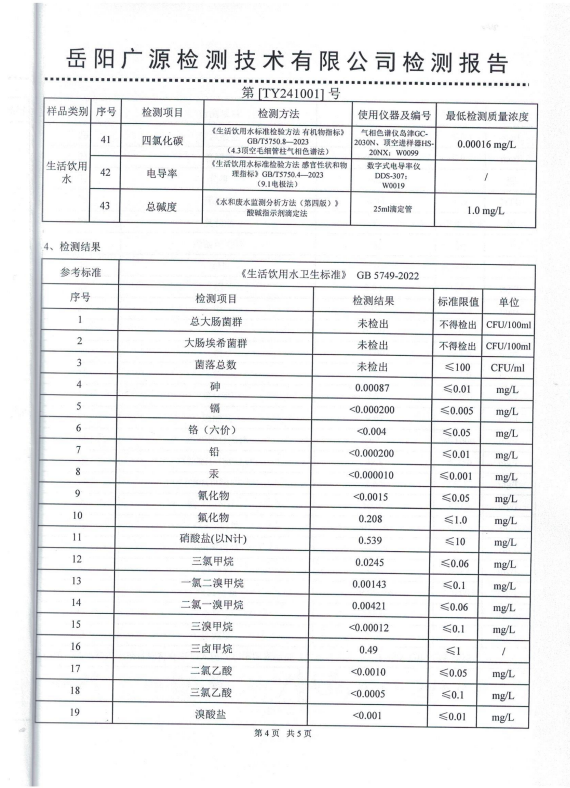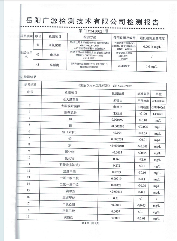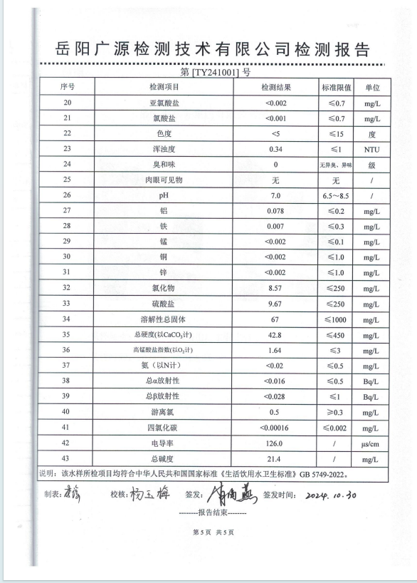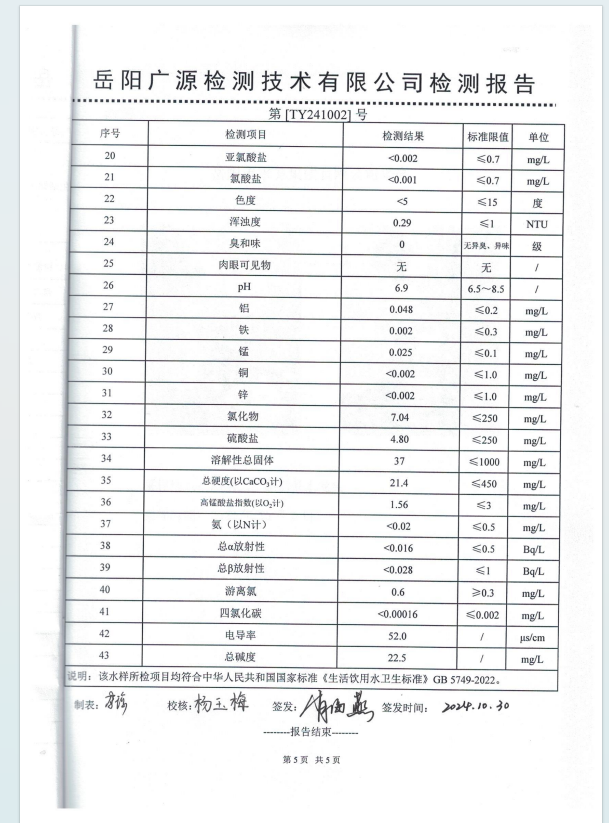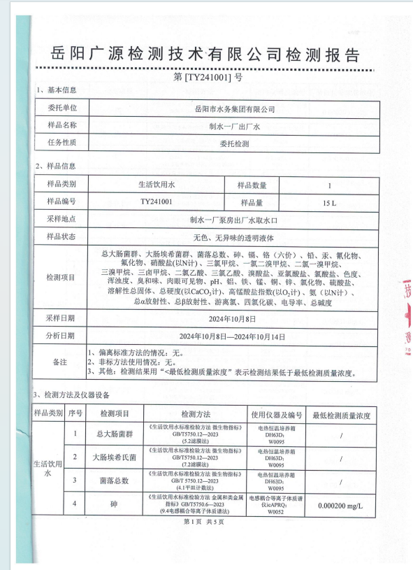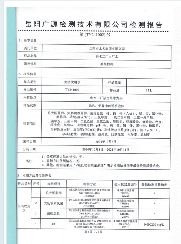2024年10月岳阳市水务集团出厂水水质检测月报表