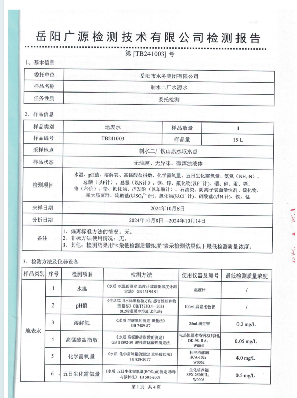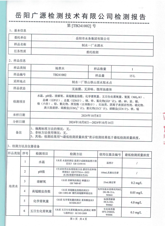 2024年10月岳阳市水务集团水源水水质检测月报表