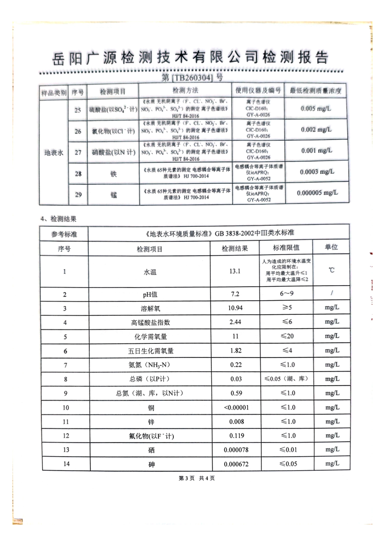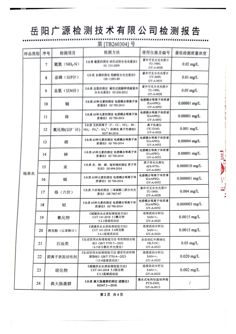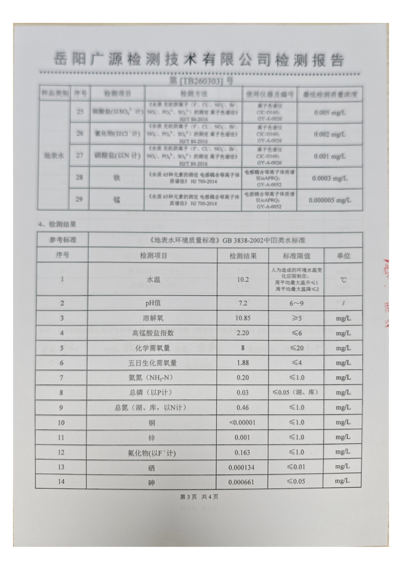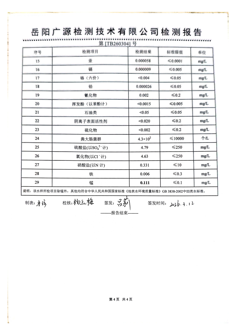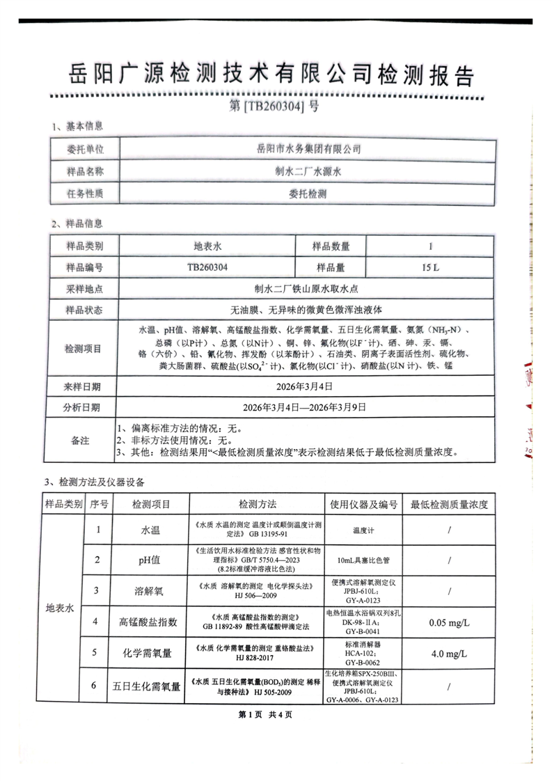 2026年3月岳阳市水务集团水源水水质检测月报表