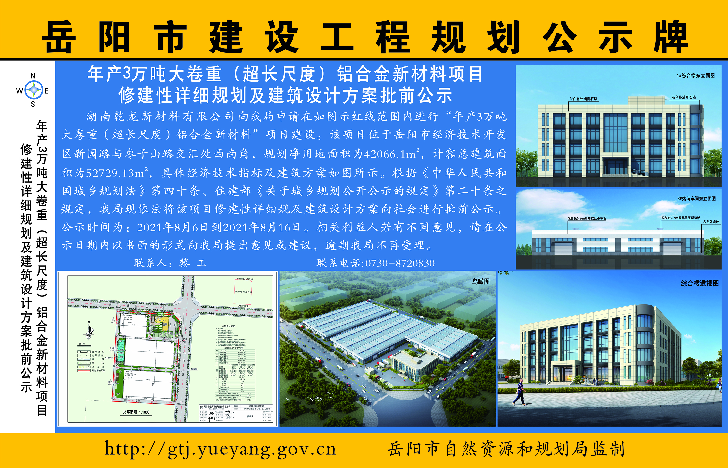 年产3万吨大卷重(超长尺度)铝合金新材料项目修建性详细规划及建筑方案批前公示