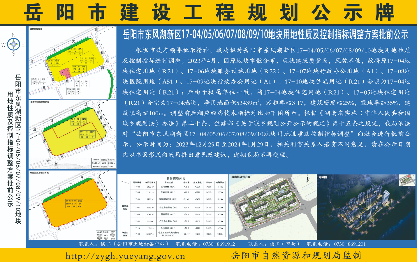 岳阳市东风湖新区17-04、05、06、07、08、09、10地块用地性质及控制指标调整论证方案批前公示