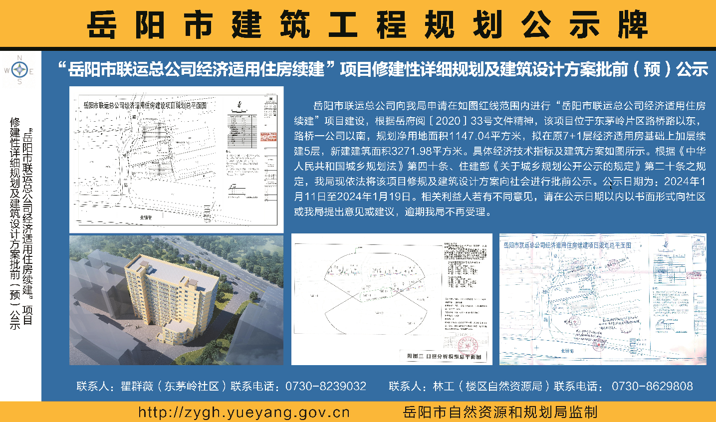 “岳阳市联运总公司经济适用住房续建”项目修建性详细规划及建筑设计方案批前(预)公示