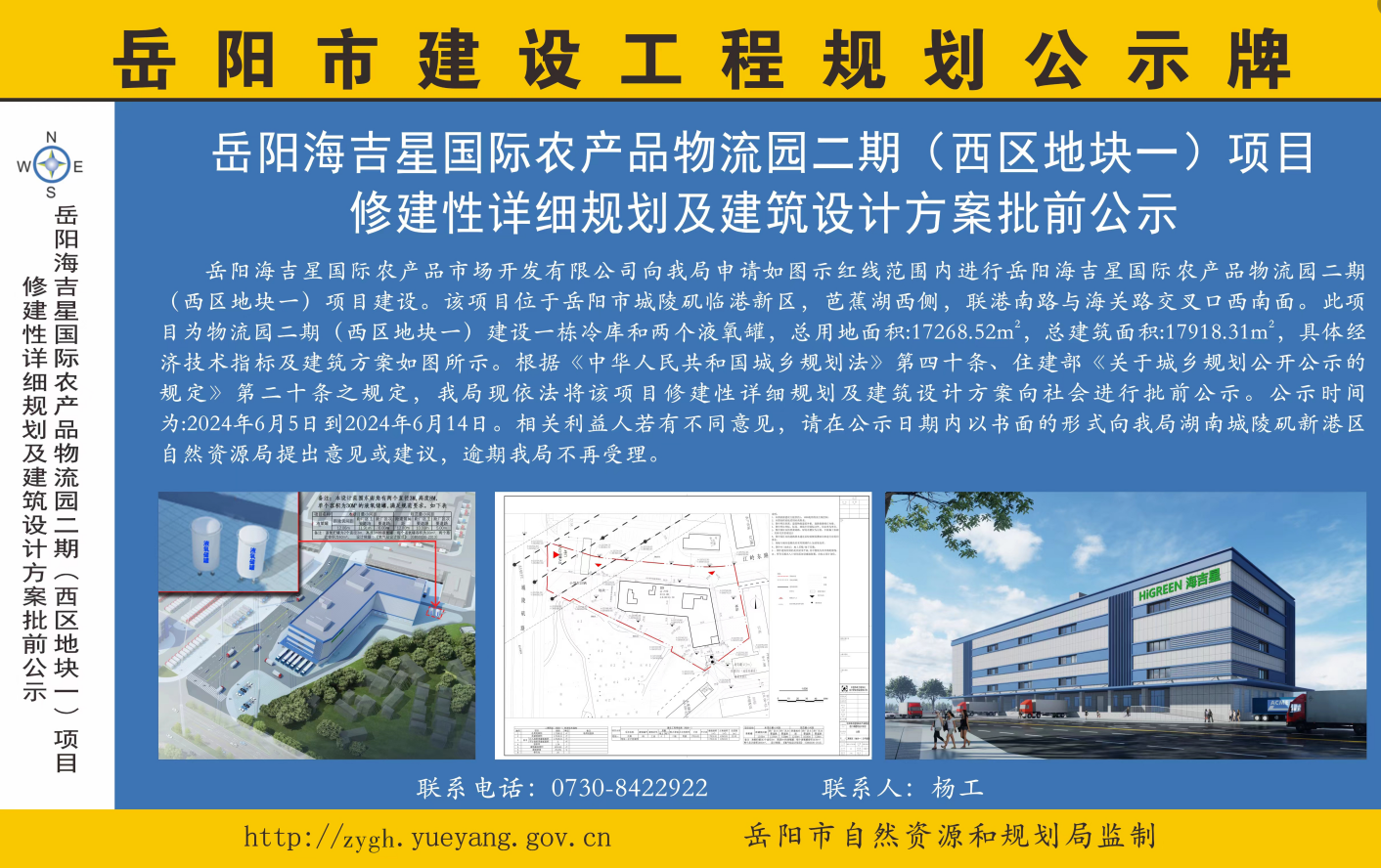 岳阳海吉星国际农产品物流园二期(西区地块一)项目修建性详细规划及建筑设计方案批前公示