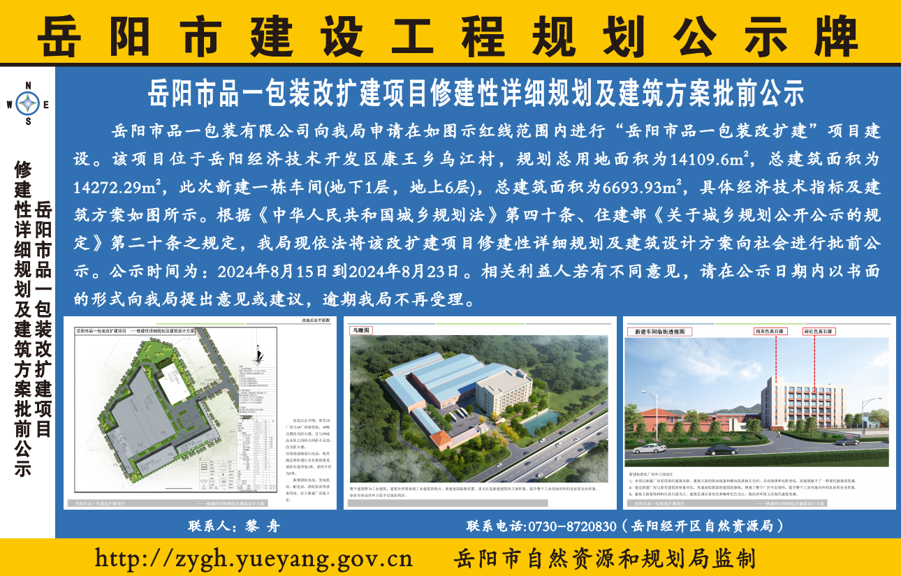 岳阳市品一包装改扩建项目修建性详细规划及建筑方案批前公示